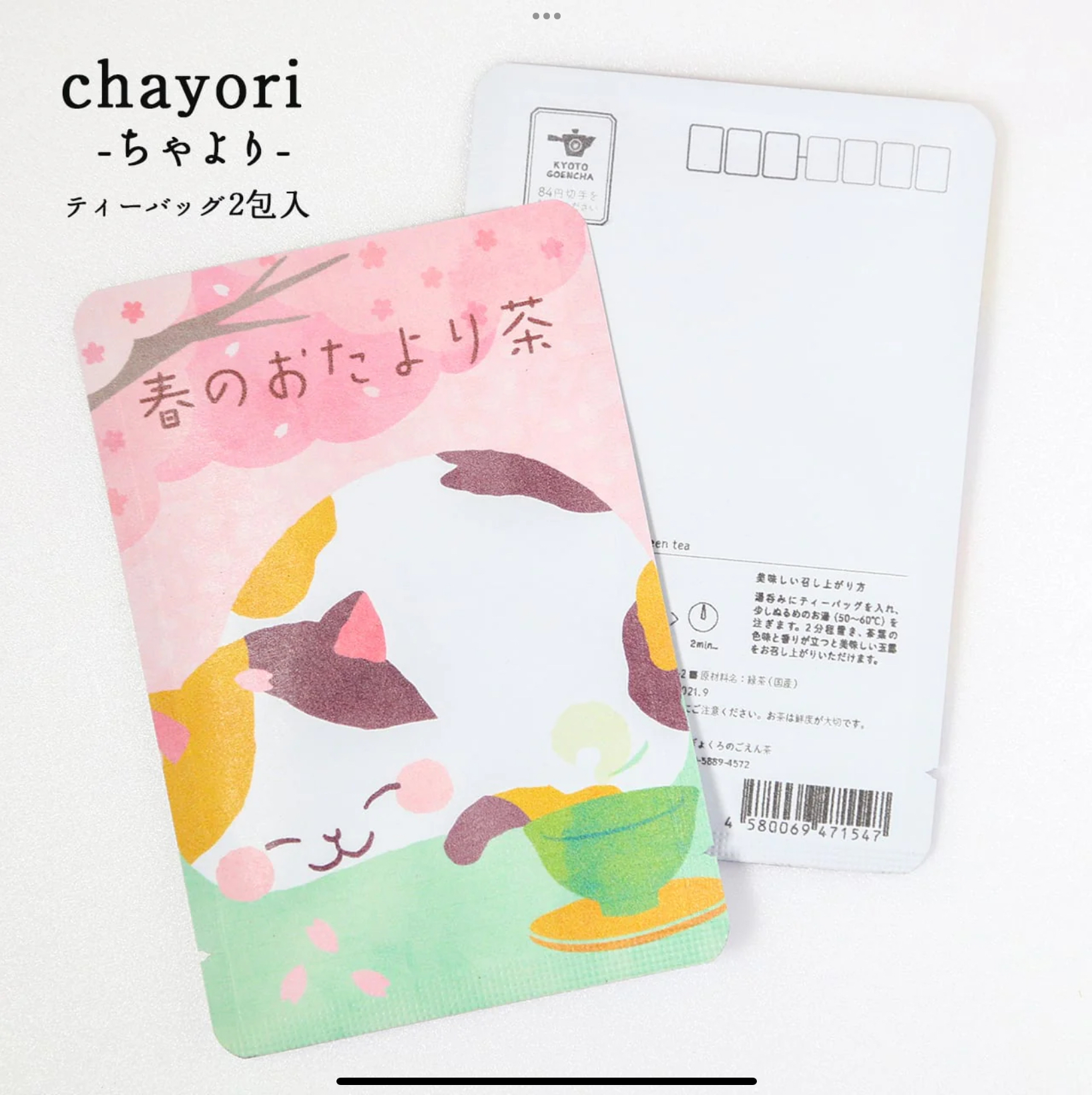 [內容物]≡茶急便|捎來春天的信息(櫻花樹下貓貓享受日光浴)|京玉露 品名:茶急便_京玉露 原材料名:綠茶_日本產 內容量:2g×2包 有效期限:12個月 保存方法:請將茶包置於乾燥陰涼處,開封後請儘速享用以確保最佳新鮮度。 * 由於茶葉容易吸收周遭氣味,請避免把茶包存放在帶有濃烈氣味的物品附近 尺寸:100 × 148(單位:mm) 原產地:日本 功能:飲用享受美味的茶葉同時包裝上的可愛有趣圖案又能讓心情愉快,放鬆身心。