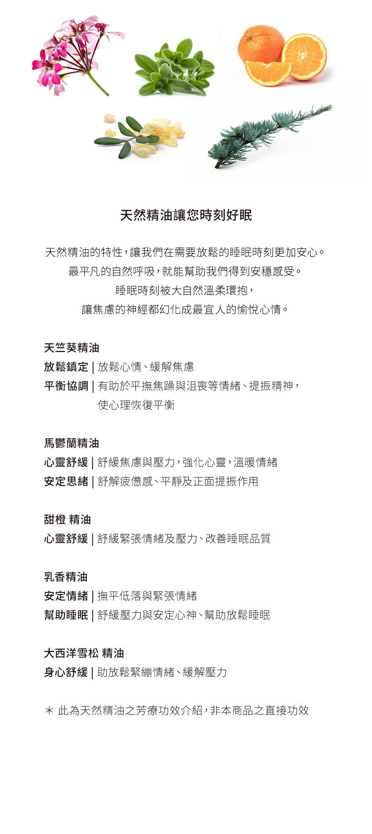 功能 :天然精油配方於寢具表面形成保護,助於舒眠及降低塵螨等過敏原隊睡眠品質的干擾。