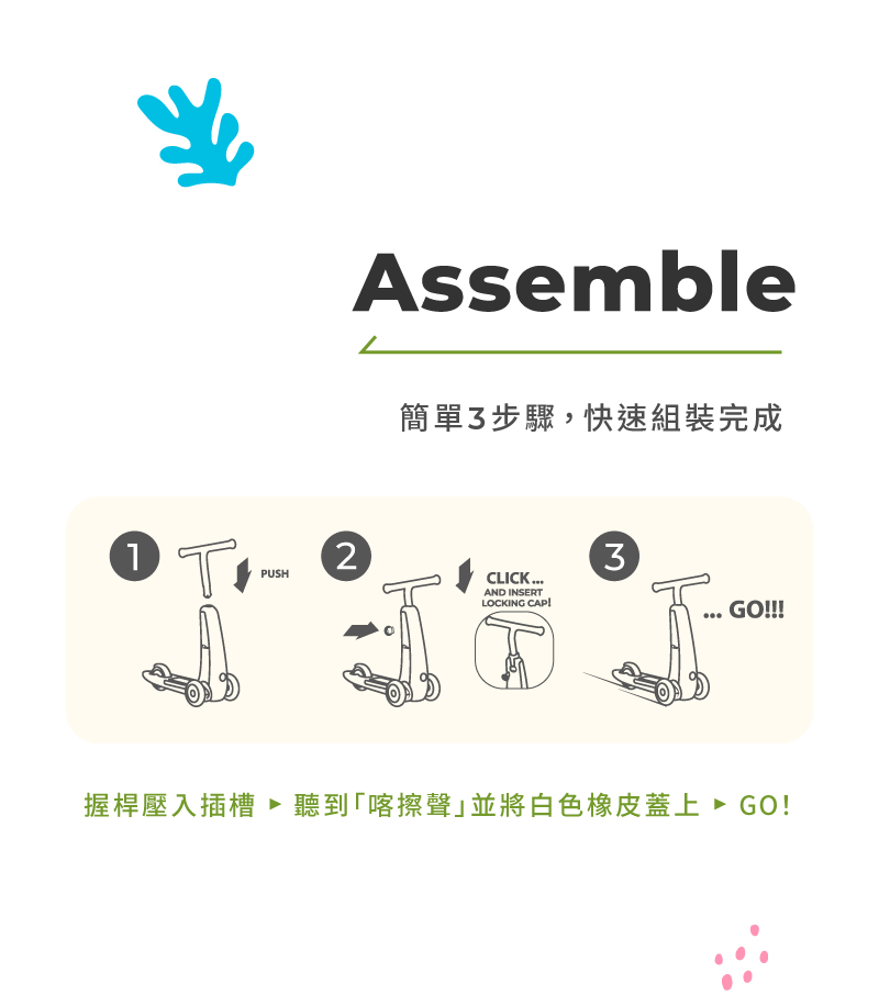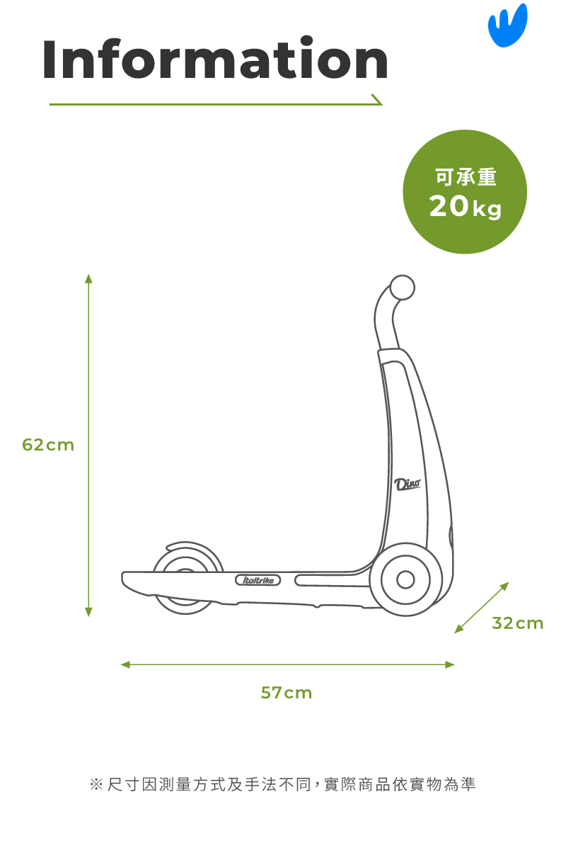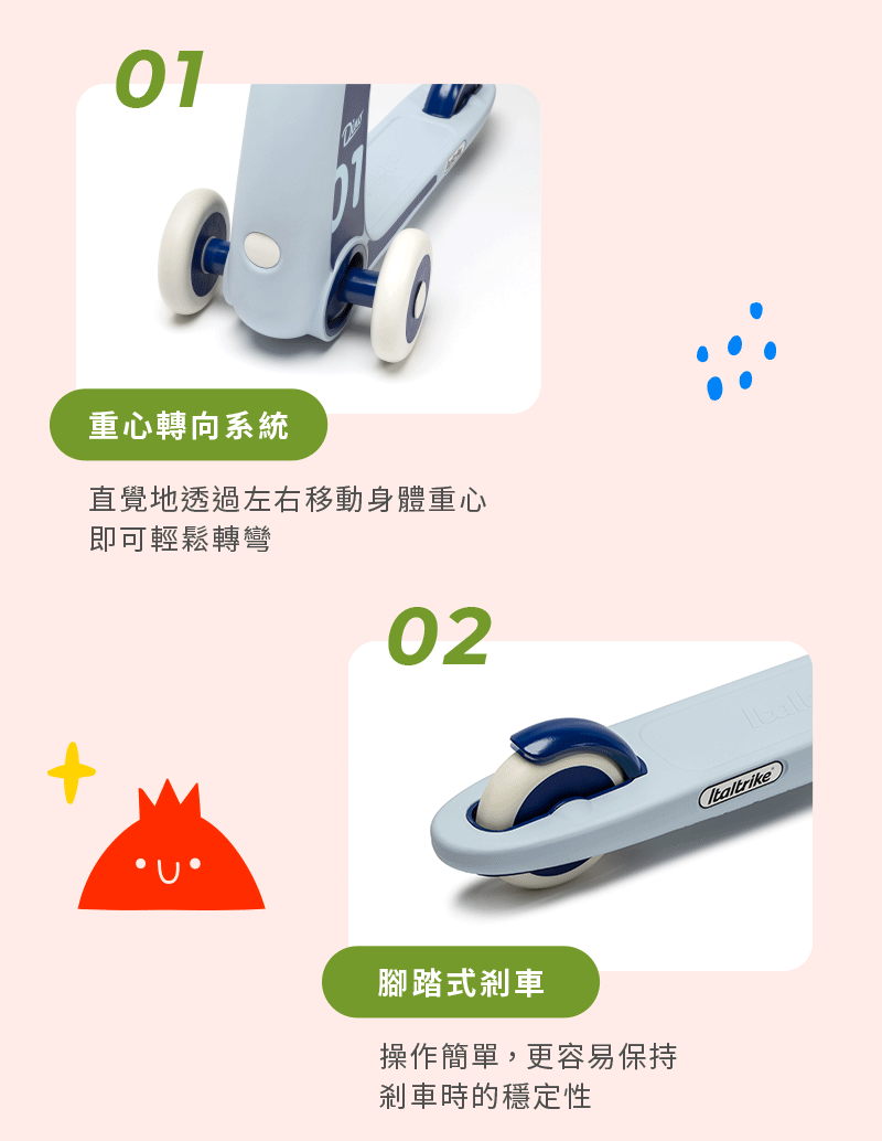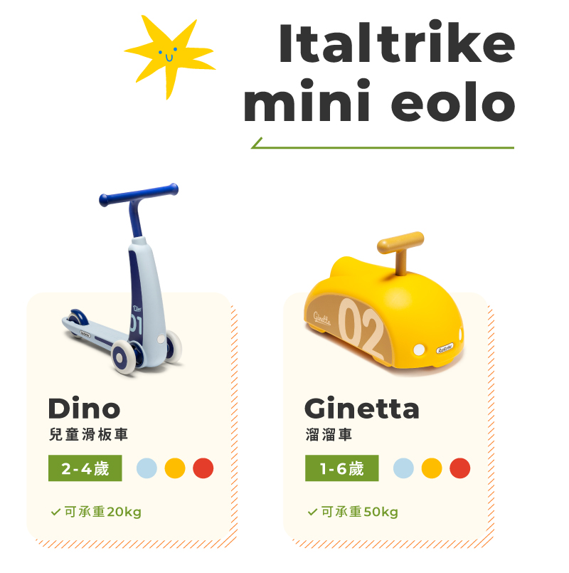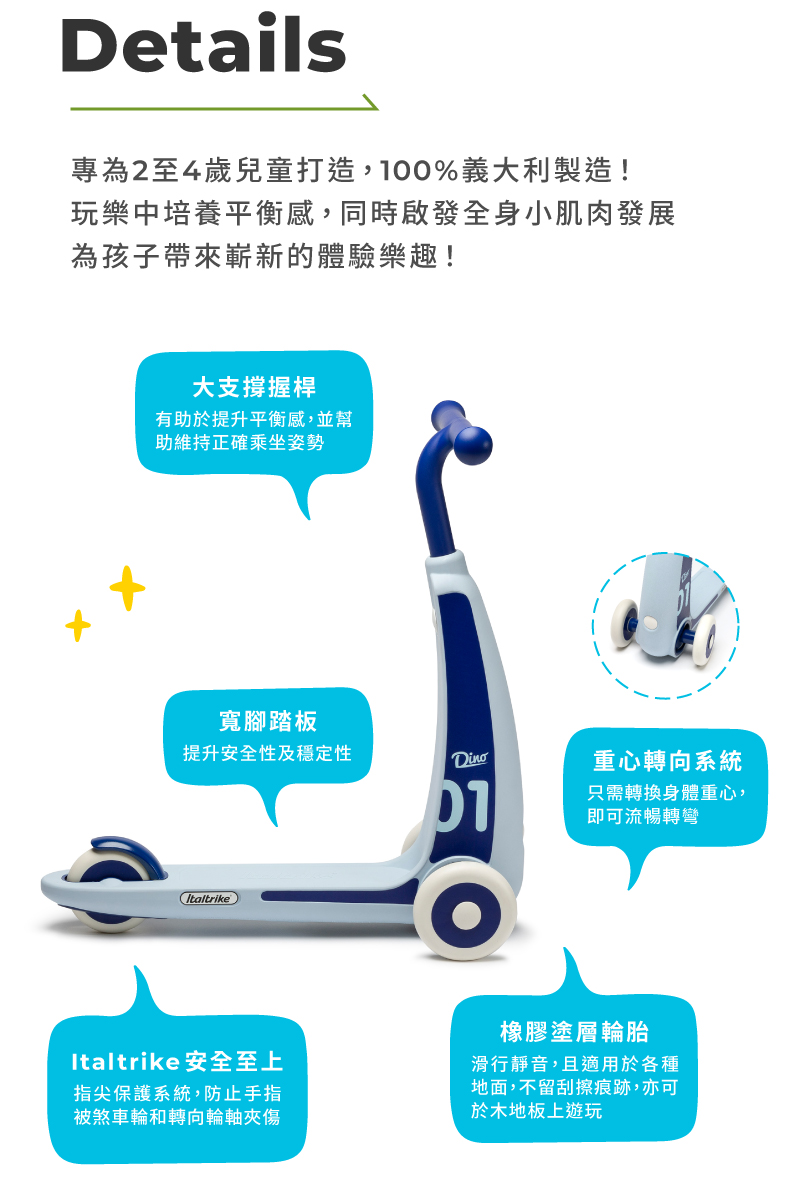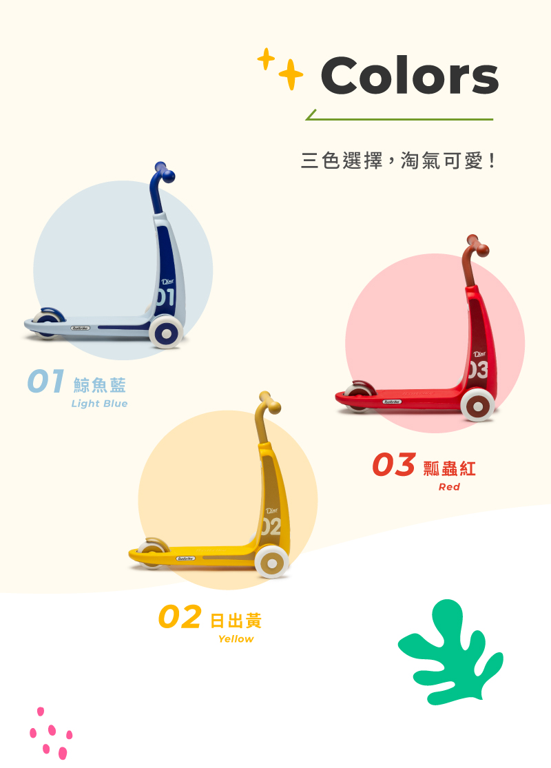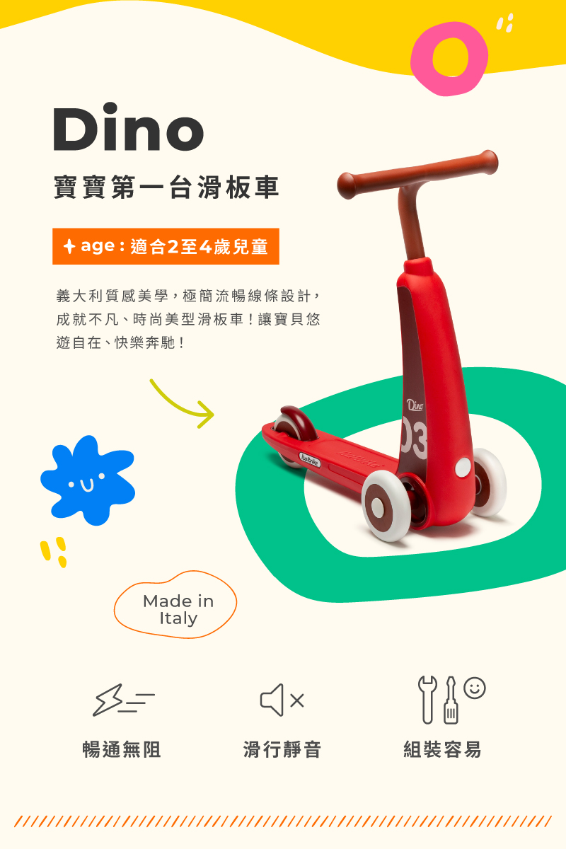 ■ 商品說明:Dino 兒童滑板車專為 2 至 4 歲兒童打造,玩樂時可幫助全身肌肉發展,亦可帶來全新的遊戲體驗。其創新的轉向系統讓孩子可直覺地通過左右移動身體重心來轉彎。Dino共提供淺藍、紅和黃三種色彩選擇,一起陪伴寶寶體驗DINO 帶來的速度感吧!
