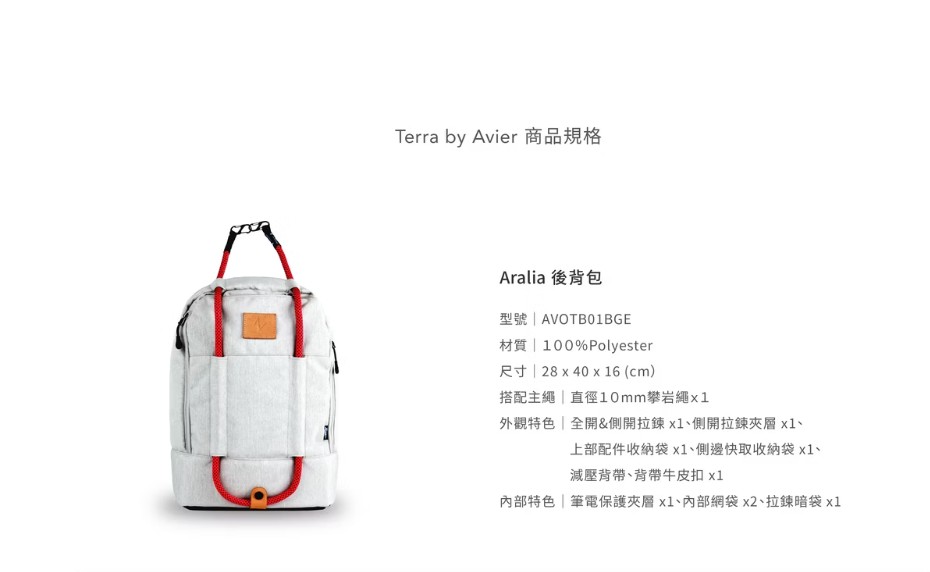 【Terra By Avier】Aralia 後背包Terra by Avier系列包款與設計師Alex Chou 周育賢合作,使用100%「Ecoya®」技術製成的環保面料,採用Terra Loki可替換式岩繩帶設計,結合攀岩元素開發出一系列極具風格的包款。Terra by Avier希望能陪伴獨具風格的您,探索世界的各個角落。Being inspired by nature, we explore the future. 以自然為啟發,探索未來的可能。