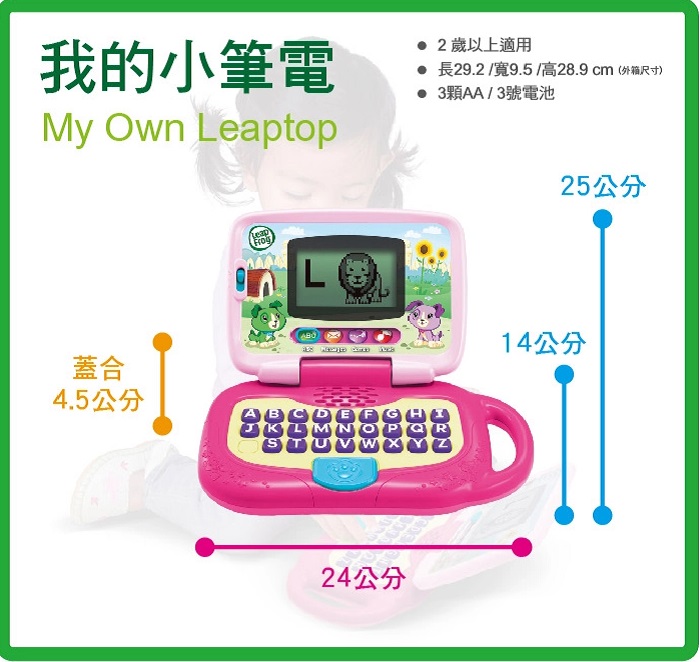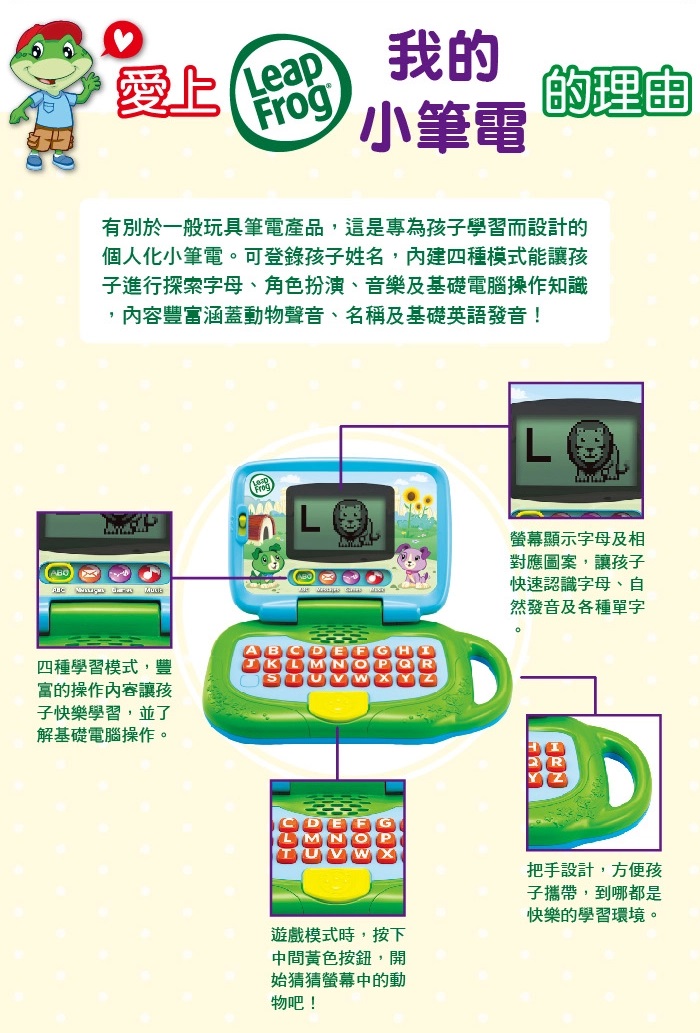 這是可登錄孩子姓名,專屬於孩子的小筆電。內容涵蓋動物聲音、名稱及基礎英語發音,還有四種模式能讓孩子進行探索字母、角色扮演、音樂及基礎電腦操作。有別於一般玩具筆電產品,這同時是為孩子學習使用而設計的,不管在操作容易度,產品安全性還是耐用度上都經過細密的考量。