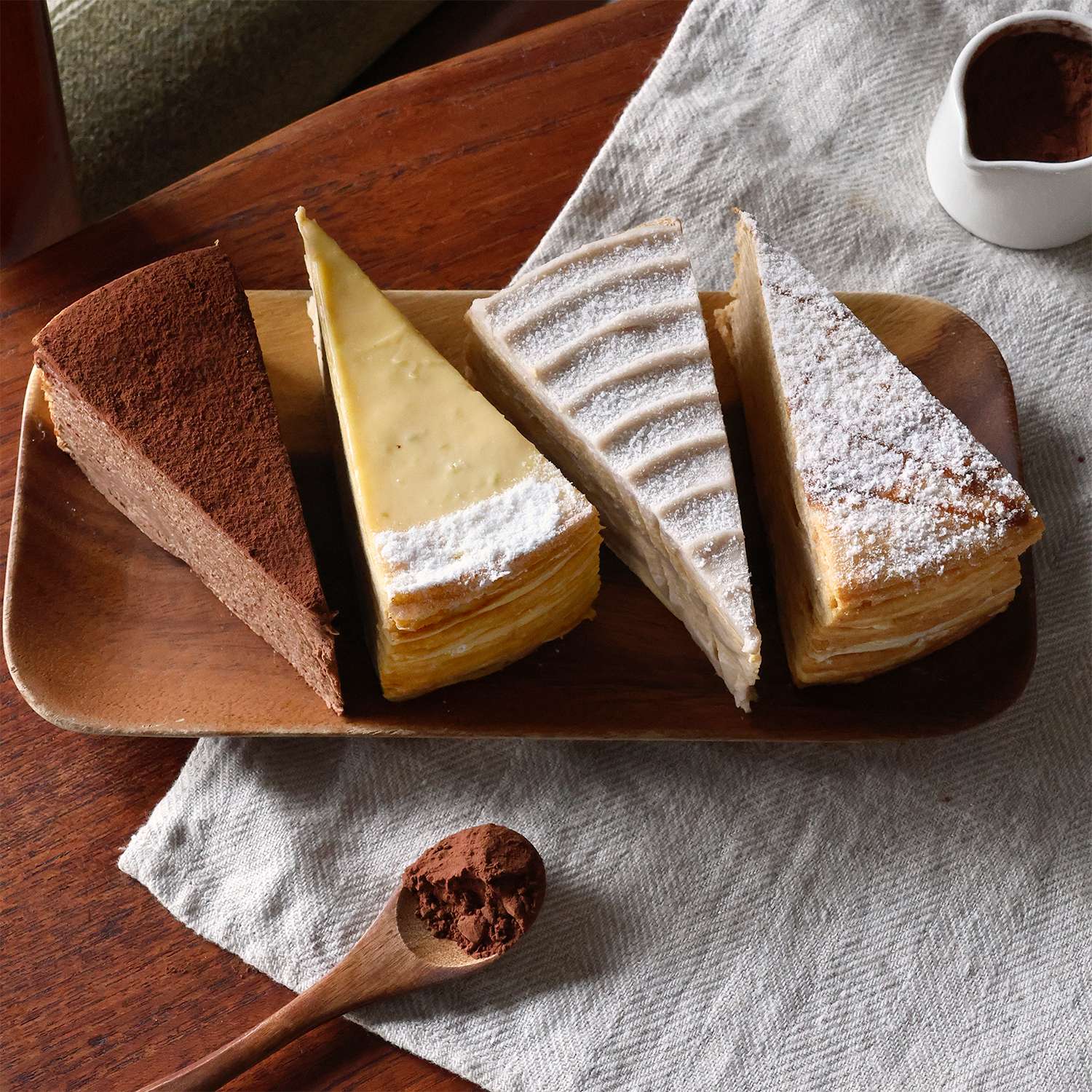 內含:檸香千層、牛奶糖千層、香芋千層、生巧千層(四種口味各一片)