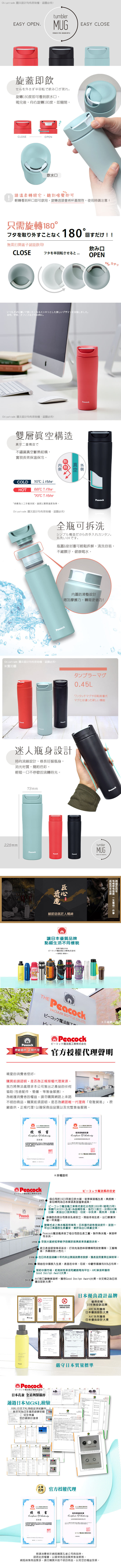 日本孔雀Peacock母公司於1923年創立於大阪,從事保溫瓶生產。與虎牌、象印牌同為日本保溫產品協會成員。十年零投訴的優質品牌-日本孔雀,百年的匠心質造,有情懷有態度,成就百年品牌,值得您安心使用。