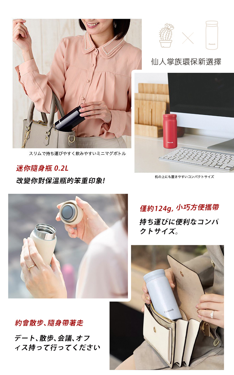 迷你隨身瓶,改變你對保溫瓶的笨重印象!仙人掌族環保新選擇,放棄拋棄式飲水瓶吧!?輕量200ml解你的渴,精巧可愛,隨身攜帶不費力,約會的小包包也可以放進去!雙層真空隔熱實現長效保溫,食用級不鏽鋼內膽,耐腐蝕不易生鏽。全瓶可水洗,密封塞輕鬆拆卸清洗不藏汙。不生汗珠,放在公事包裡也不怕!