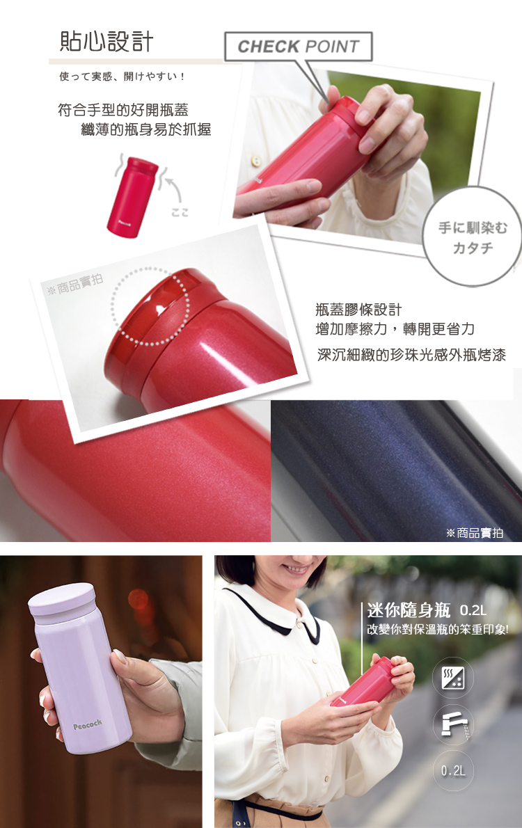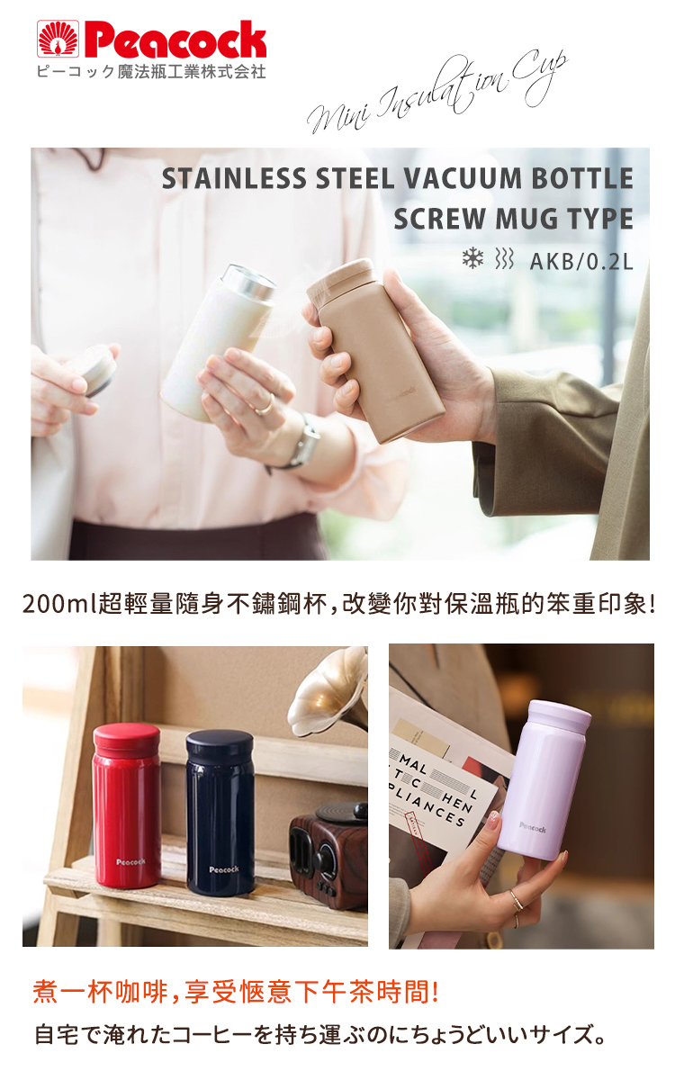 容量:0.2(L)口徑:35(mm)商品尺寸:約57x57x136(mm)重量:本體約0.124(kg)材質:內瓶-不鏽鋼SUS304 外瓶-不鏽鋼SUS304 (丙烯樹脂噴塗) 瓶口-不鏽鋼 SUS304 上蓋-聚丙烯樹脂 密封圈-矽膠保溫效力:1小時85℃以上,6小時61℃以上保冷效力:6小時11℃以下產地:日本孔雀-中國廠