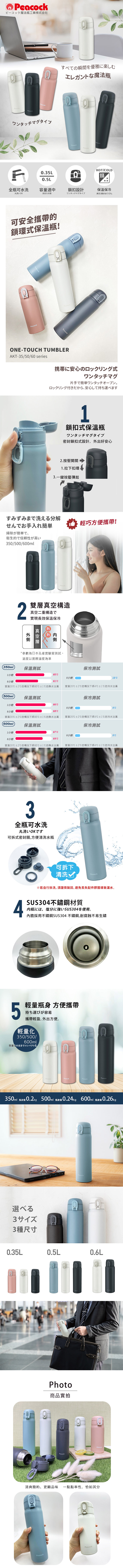 顏色:藍/白/黑口徑:38(mm)尺寸:64x72x237(mm)重量:0.24(kg)材質:內瓶-不鏽鋼SUS304 外瓶-不鏽鋼SUS304 (丙烯樹脂噴塗) 瓶口-不鏽鋼SUS304 瓶蓋 上蓋-聚丙烯樹脂 密封圈-矽膠保溫效力:6小時68℃以上/1小時86℃以上保冷效力:6小時9℃以下產地:日本孔雀-中國廠