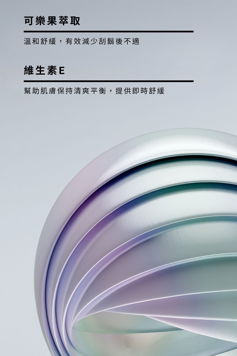 關鍵成分: 矽膠成分能使剃刀與肌膚之間變得舒適滑順。 可樂果萃取具有舒緩及對抗刺激的保護作用。 維他命E具有強效的抗氧化功能,幫助中和損傷肌膚的自由基。 沒藥醇能舒緩、鎮靜肌膚。