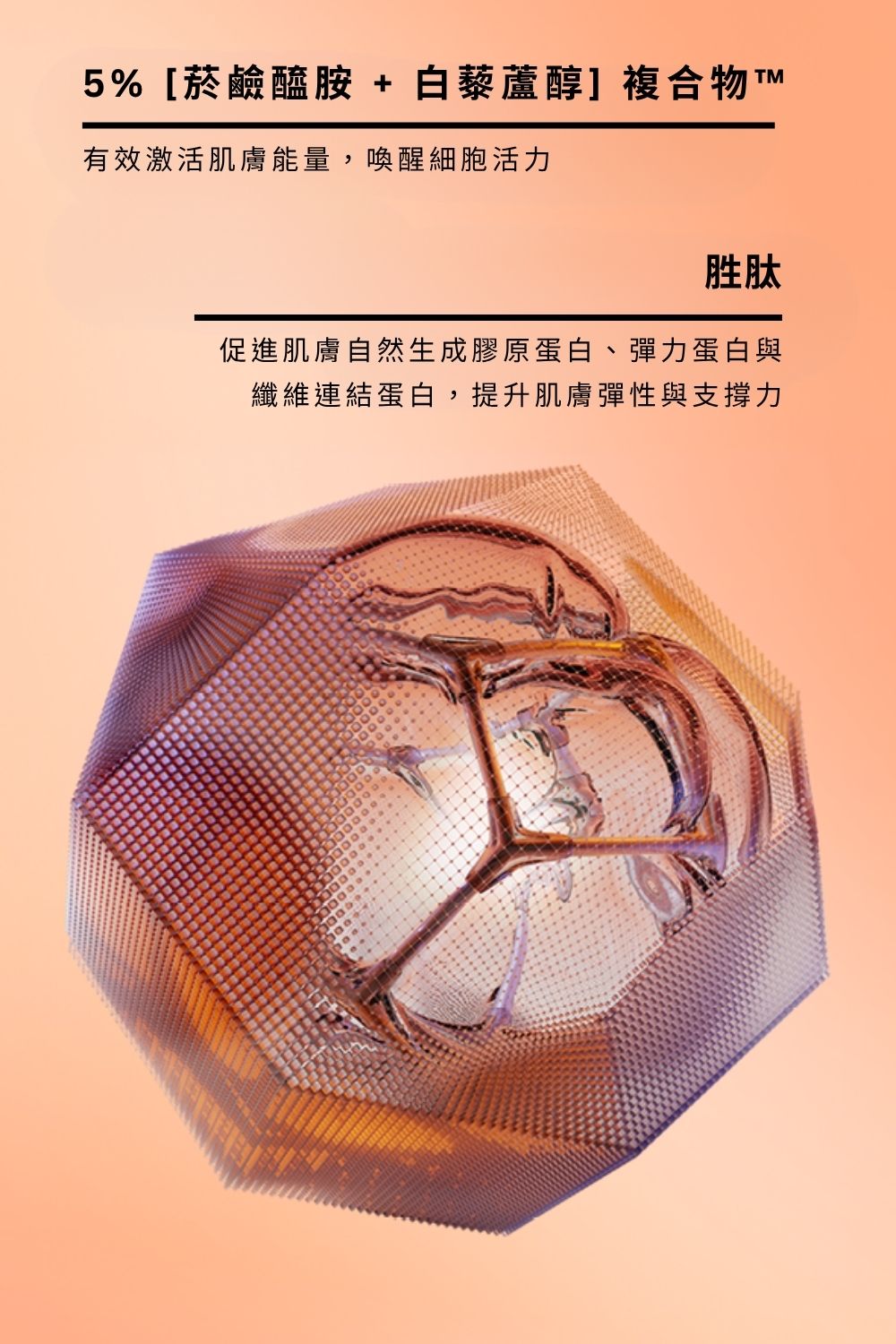 關鍵成分: 寡肽-幫助增加皮膚膠原蛋白、彈性蛋白、纖維連接蛋白的自然生成,使皮膚看起來更年輕。 5% 菸鹼醯胺、白藜蘆醇複合物-增強細胞能量,改善肌膚的疲倦感。 海藻萃取和維生素 E-提供抗氧化效能,有助於防止自由基引起氧化壓力,及減緩皮膚老化。