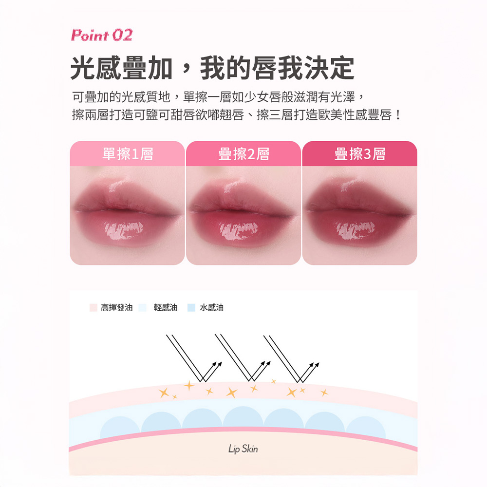 可疊加的光感質地,單擦一層如少女唇般滋潤有光澤