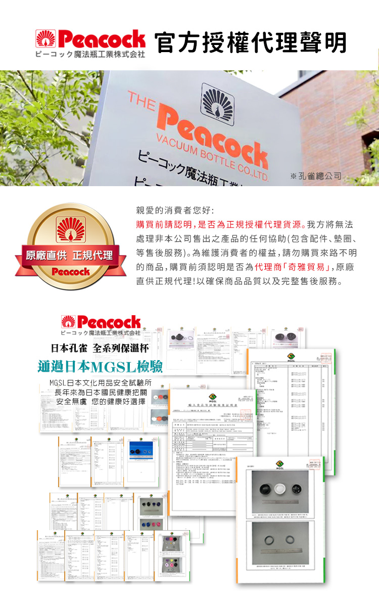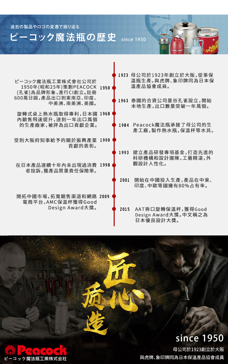 日本孔雀Peacock母公司於1923年創立於大阪,從事保溫瓶生產。與虎牌、象印牌同為日本保溫產品協會成員。十年零投訴的優質品牌-日本孔雀,百年的匠心質造,有情懷有態度,成就百年品牌,值得您安心使用。