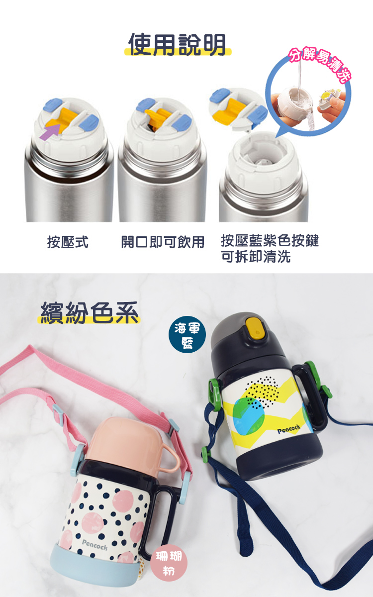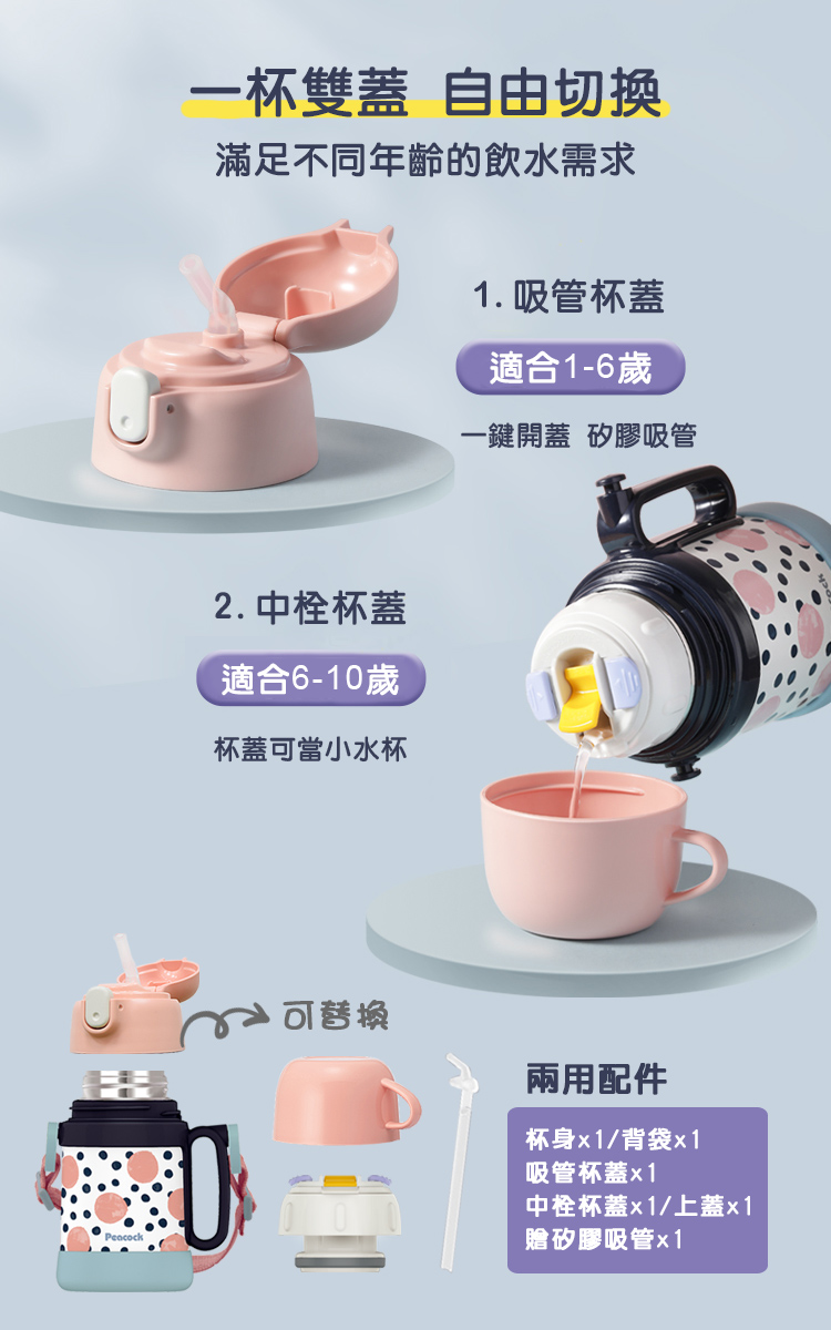 容量:吸管杯時0.40(L)/杯蓋時0.36(L)口徑:42(mm)尺寸:吸管杯時117×86×165(mm)、杯蓋時117×86×153(mm)(附可拆式背帶)重量:0.37(kg)材質:不鏽鋼 SUS304 杯蓋-聚丙烯樹脂 把手-聚丙烯樹脂 飲嘴(吸嘴)-矽膠 吸管-聚丙烯樹脂 墊圈-矽膠保溫效力:6小時68℃以上保冷效力:6小時10℃以下產地:日本孔雀-中國廠