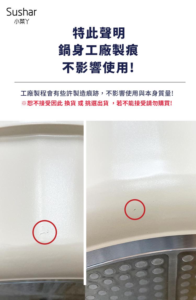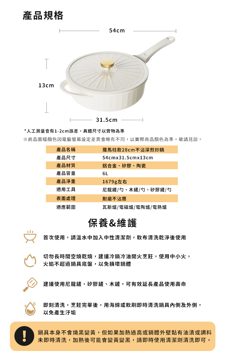 溫馨提醒:切勿高溫乾燒、金屬物磨損、熱鍋冷水清洗!清洗後請給不沾鍋塗上一層食用油(牛油及豬油除外),這樣可以延長鍋具的使用壽命喔!※請勿使用微波爐跟洗碗機、烘碗機。※鍋子、配件,屬於正常消耗品無保固,請愛護與正當使用方可延長壽命。