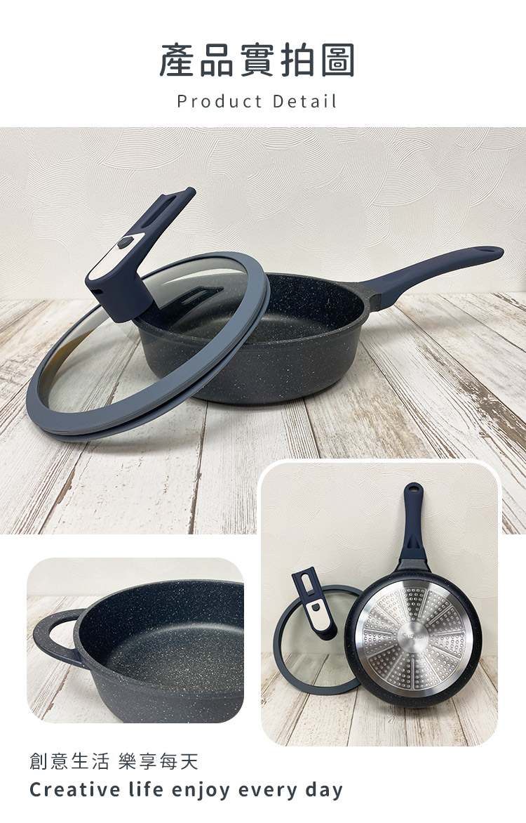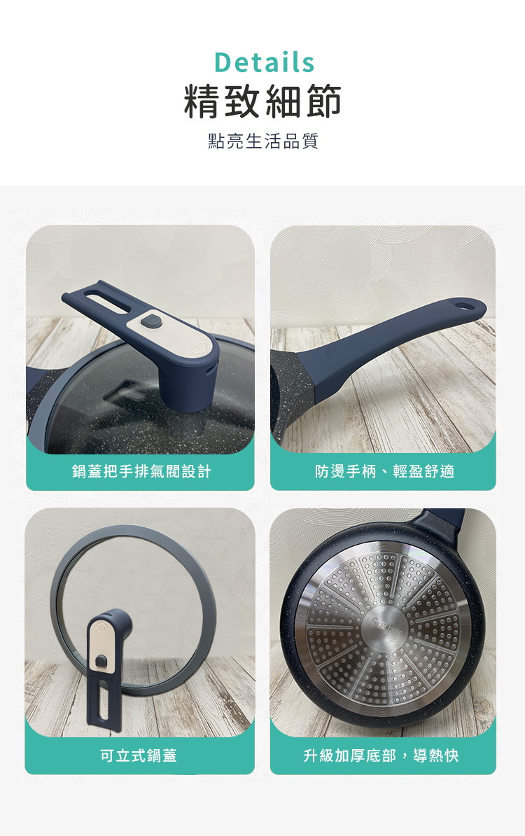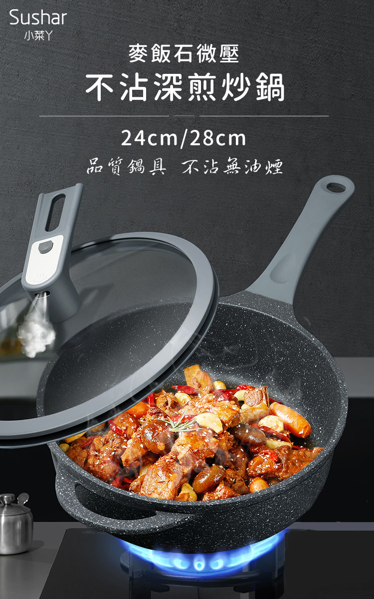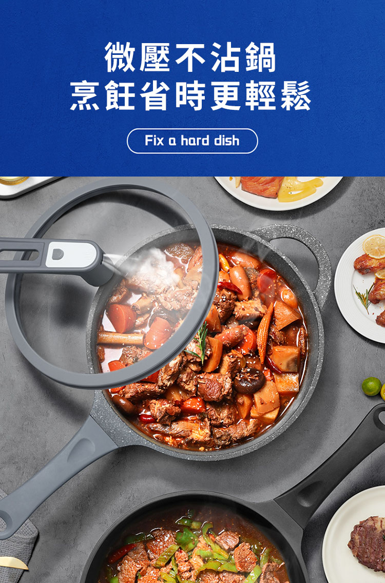 ●麥飯石微壓不沾鍋,烹飪省時更輕鬆●安全手動排氣閥,高溫不燙手●高溫壓鑄一體成型,鍋身不易變形●適用於所有烹煮爐具,全適用對應設計 ●輕量化鍋體,翻鍋煎炒更輕盈●防燙把手&可立式鍋蓋●食品級矽膠密封圈,高密封性低噪音