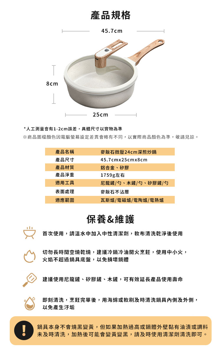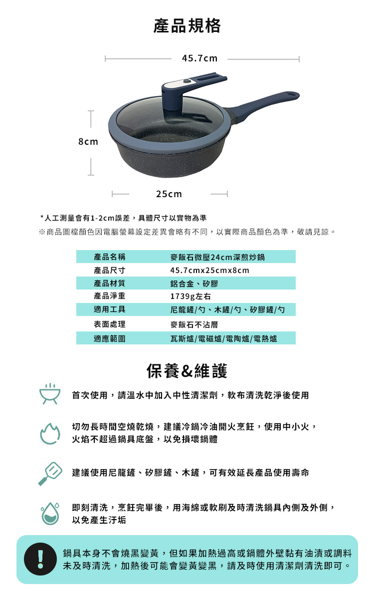 ●24cm炒鍋規格:尺寸: 45.7cmx25cmx8cm (人工測量會有1-2cm誤差,具體尺寸以實物為準)材質: 鋁合金、矽膠表面處理:麥飯石不沾層適用工具:尼龍鏟/勺、木鏟/勺、矽膠鏟/勺適應範圍: 電磁爐、瓦斯爐、卡式爐、電陶爐、鹵素爐全適用產地:中國
