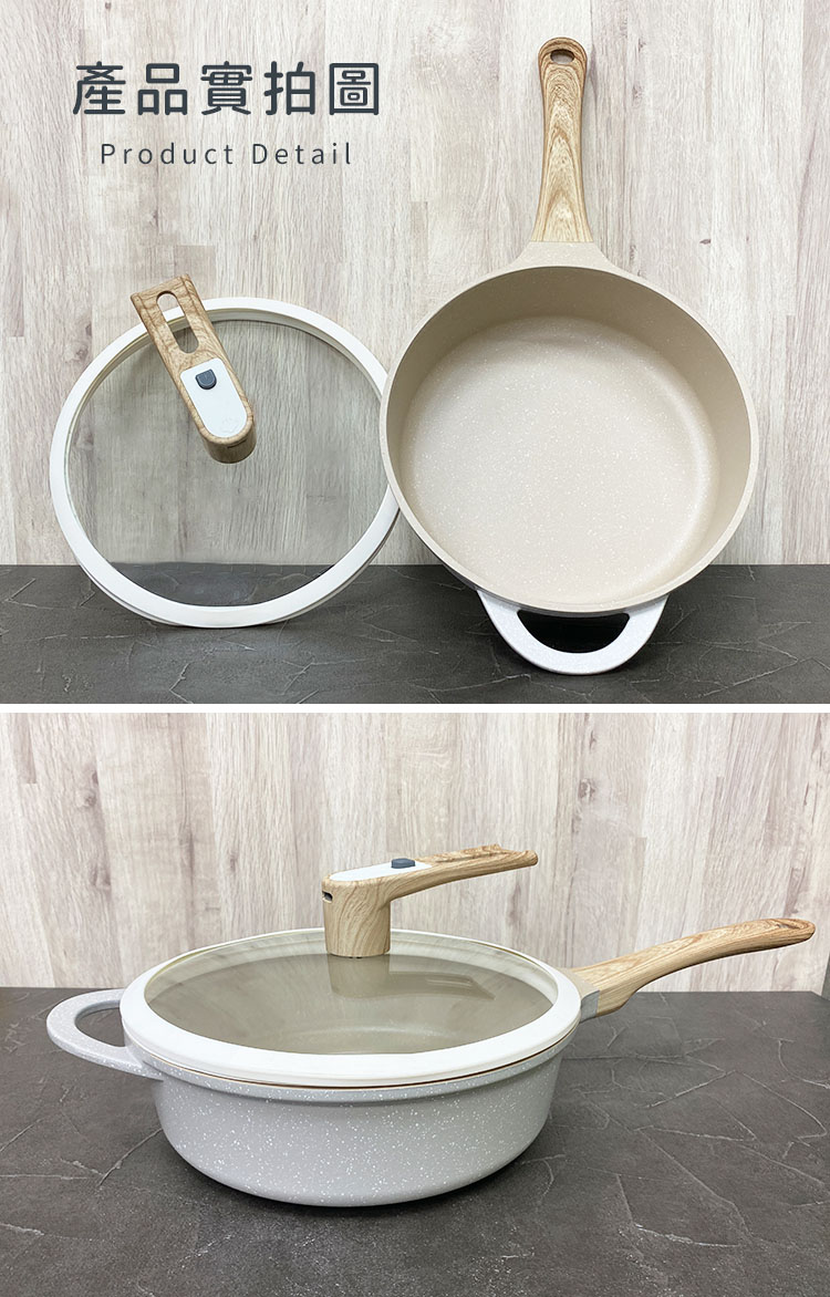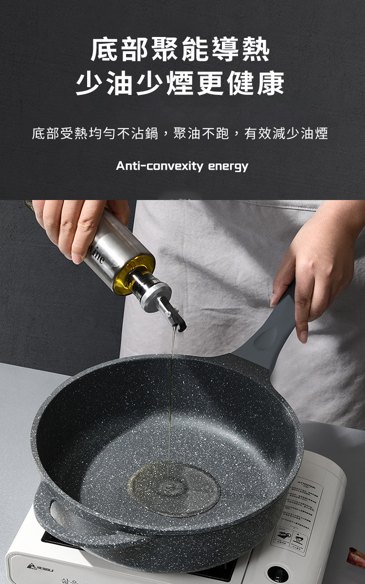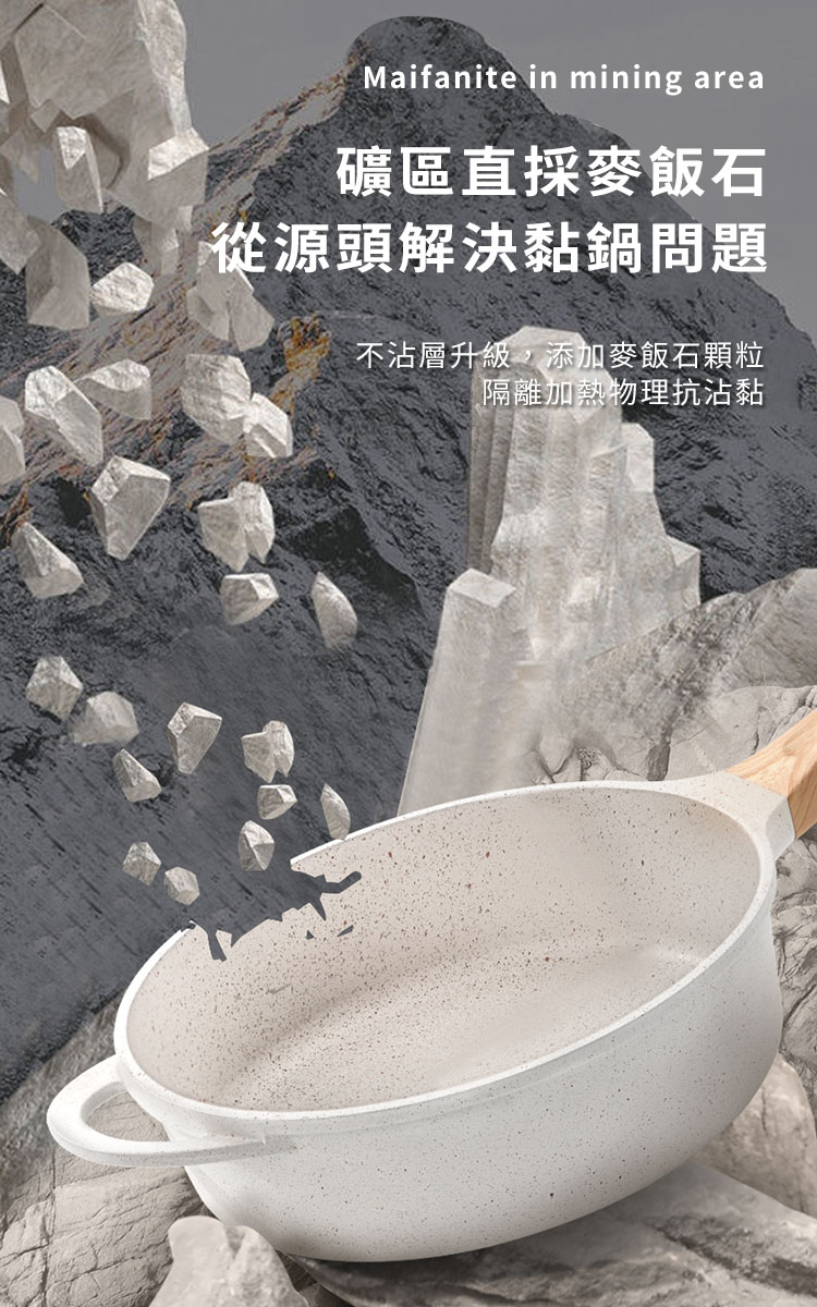 ●麥飯石強化不沾層麥飯石不沾塗層,煎蛋不沾鍋。方便清洗,一擦即淨,不易殘留茲生細菌。