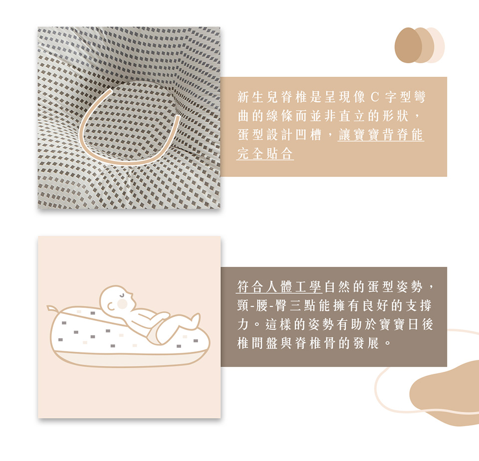 蛋型凹槽設計gunite寶寶懶骨頭採用蛋型凹槽設計,專為新生兒脊椎設計,能夠完全貼合寶寶的脊椎。蛋型凹槽符合人體工學,擁有極佳的支撐力,完美支撐住寶貝尚未發展健全的脊椎,並能有效幫助寶寶的椎間盤及脊椎骨的發展。