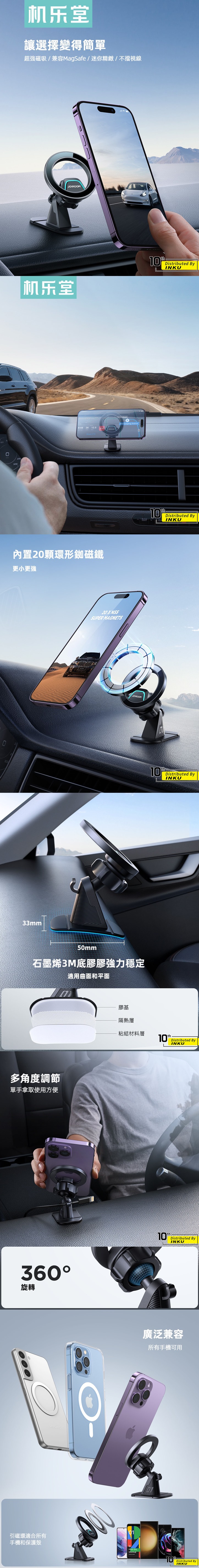 1.內建20顆環形銣磁鐵,相容於MagSafe,配置引磁環,所有手機可用2.石墨烯3M底膠膠強力穩定,適用曲面及平面儀表台3.迷你精緻,理線設計,隨時保持車內整潔,不擋視線4.360°旋轉,多角度調節,單手拿取使用方便5.螢光矽膠設計,漆黑夜晚快速找到手機支架
