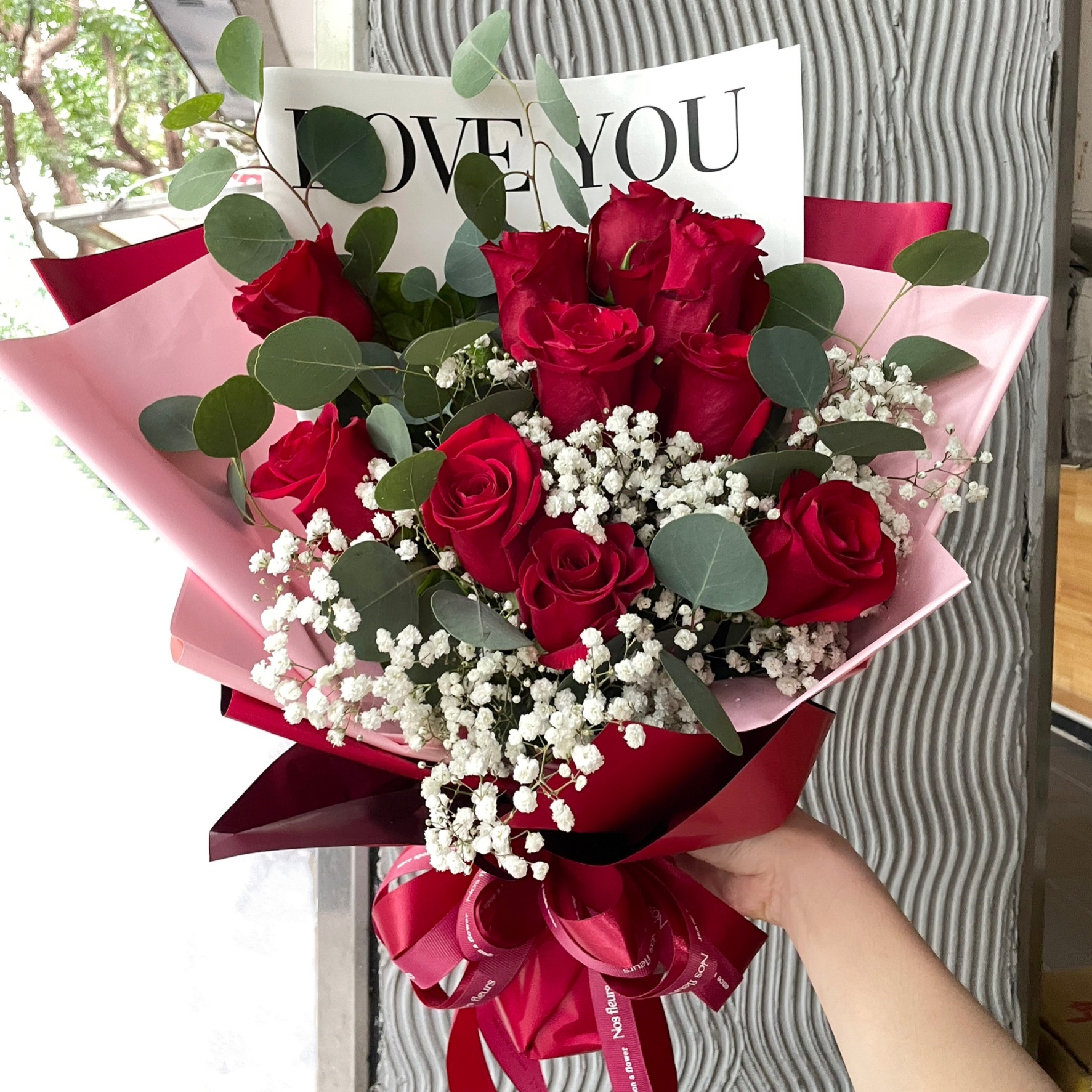 花禮說明:進口紅玫瑰9朵+滿天星+當季葉材+浪漫包裝花禮尺寸:32×45公分