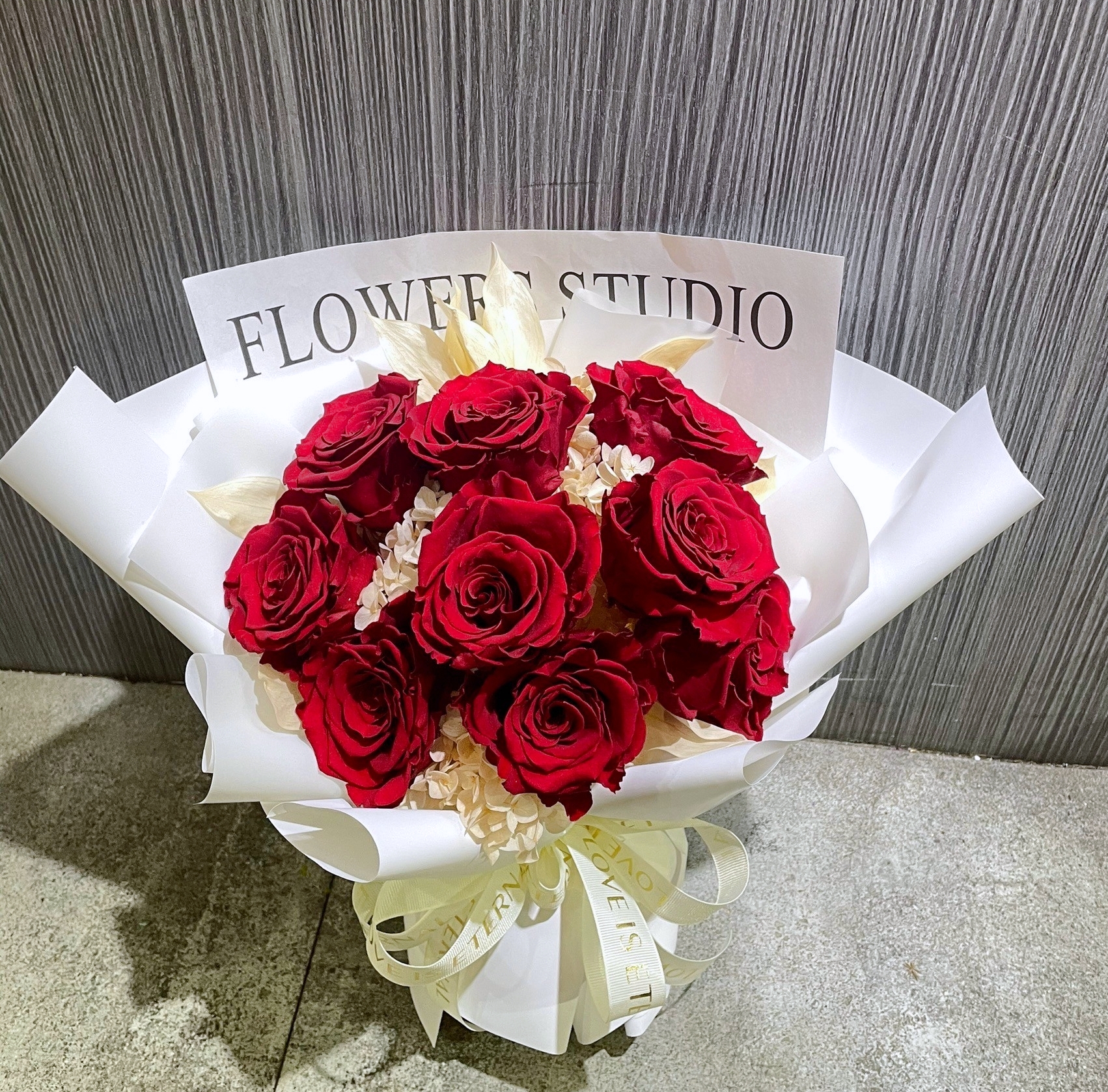 花禮說明:厄瓜多Roseamor永生玫瑰大朵9朵+繡球花+小碎花搭配花禮尺寸:30×40公分