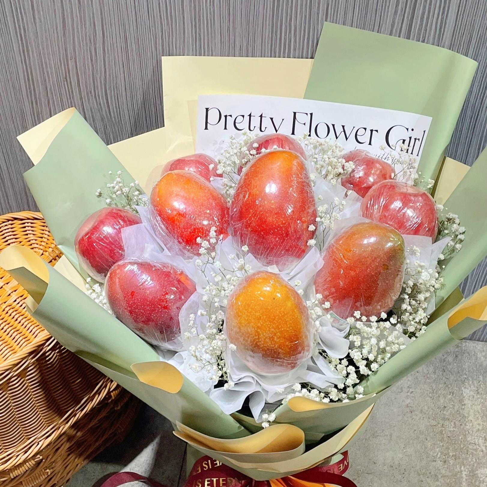 花禮說明:新鮮芒果6顆+蘋果5顆+滿天星包裝花禮尺寸:35×40公分