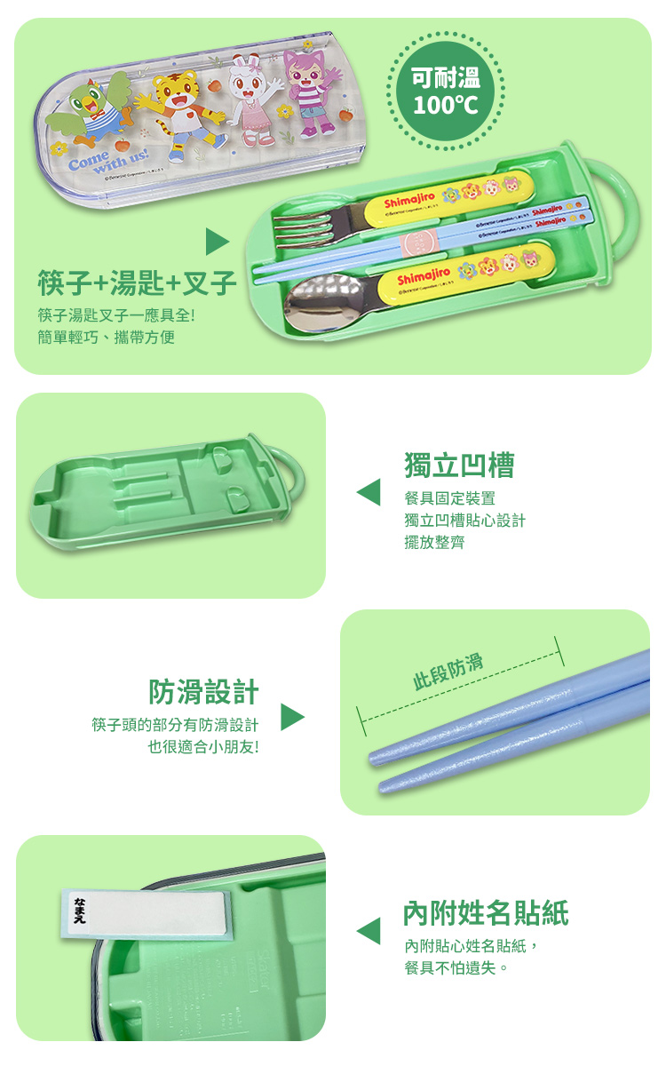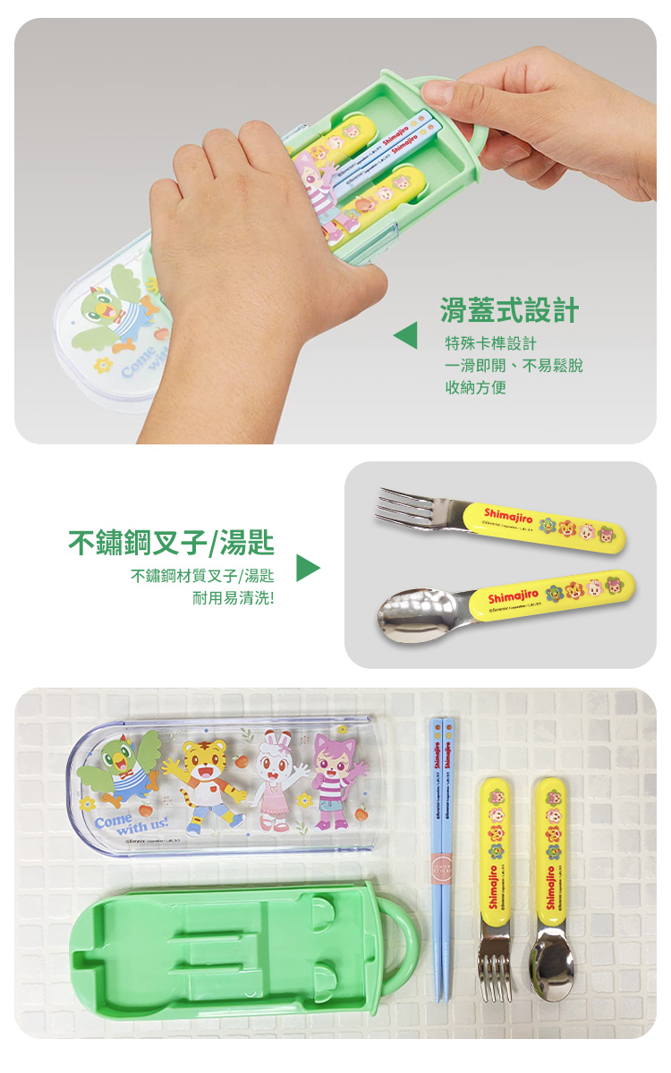 ●筷子湯匙叉子 一應具全●內附姓名貼紙,不怕遺失餐具●滑蓋式設計,收納方便,簡約輕巧●筷子頭的部分有防滑設計,方便夾取食物!