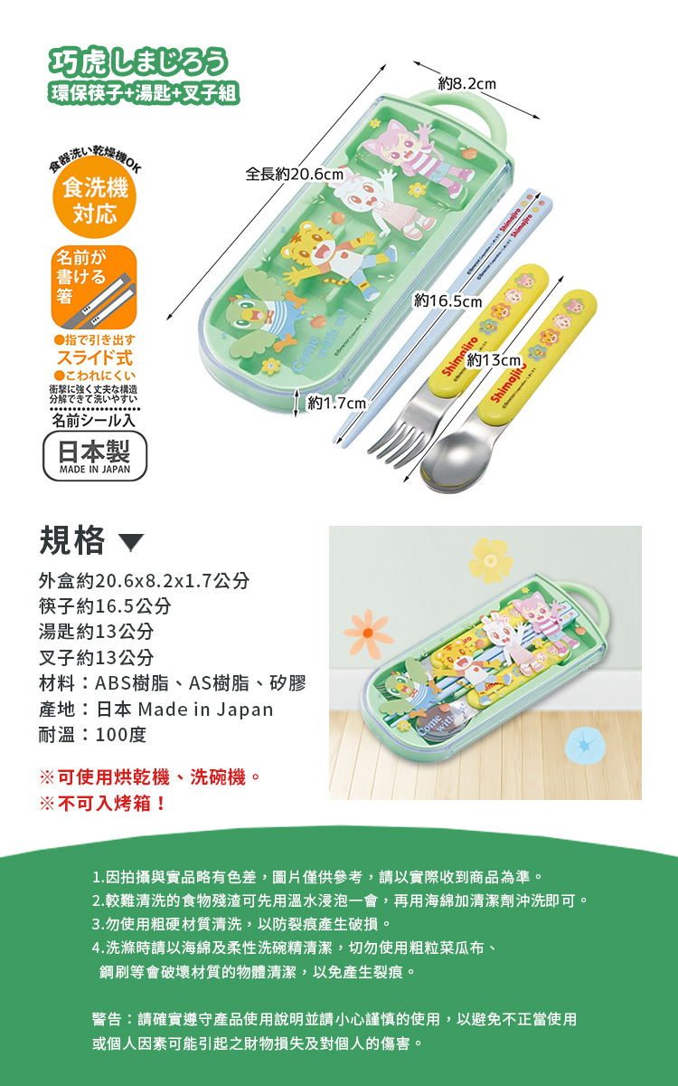 品牌:日本SKATER原廠公司貨-平行輸入外盒約20.6x8.2x1.7公分筷子約16.5公分湯匙約13公分叉子約13公分材料:ABS樹脂、AS樹脂、矽膠重量:約151g(含包裝)(手量誤差±5%)產地:日本 Made in Japan耐溫:100度