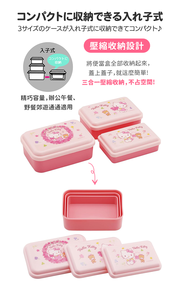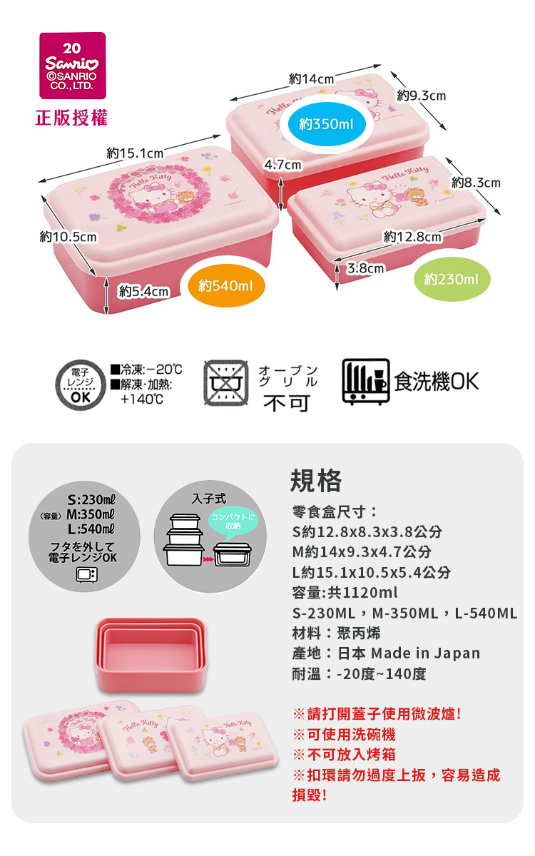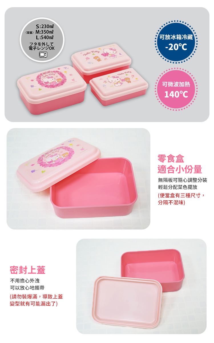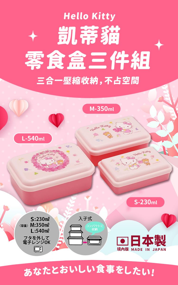 日本 Made in Japan (日本限定版) 日本正版授權到了午休時間,拿出超可愛又精緻的便當盒!日本製餐盒,日本OL、女孩最愛。三個容量230ml+350ml+540ml,分隔不混味,不用擔心外洩,可以放心地攜帶!精巧容量,辦公午餐、野餐郊遊通通適用。