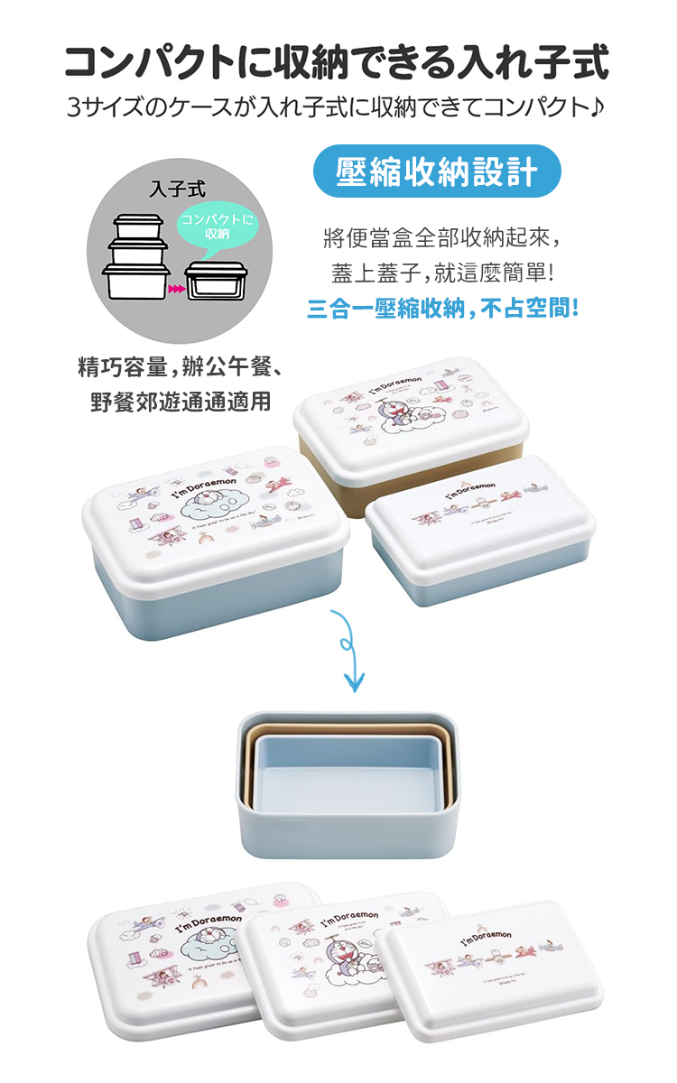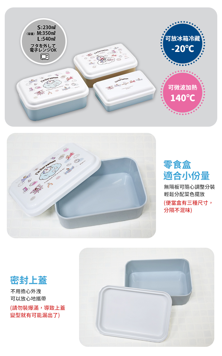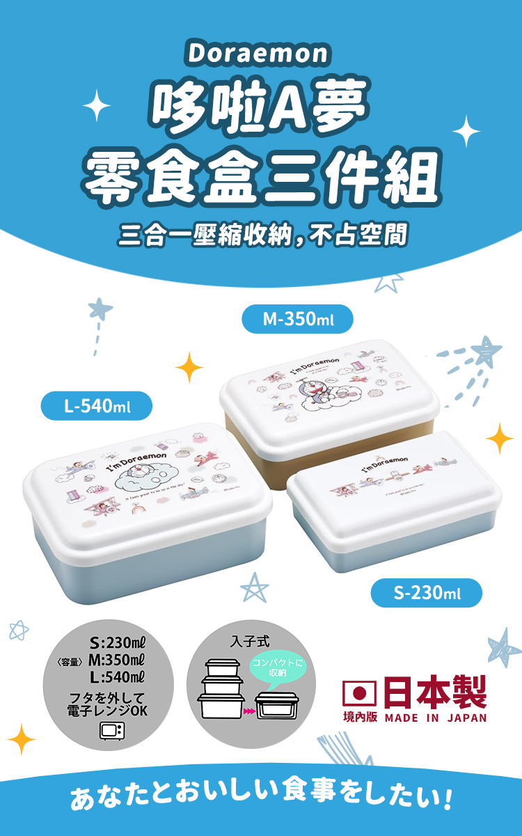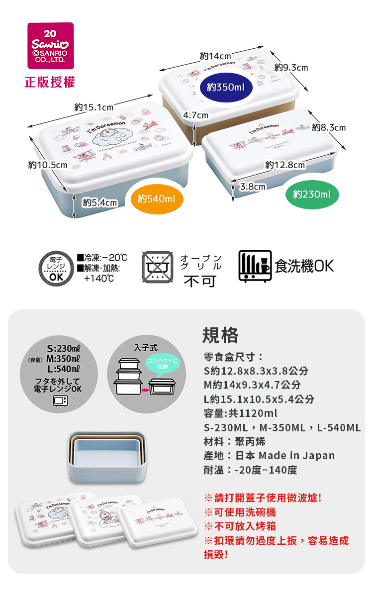 日本 Made in Japan (日本限定版) 日本正版授權到了午休時間,拿出超可愛又精緻的便當盒!日本製餐盒,日本OL、女孩最愛。三個容量230ml+350ml+540ml,分隔不混味,不用擔心外洩,可以放心地攜帶!精巧容量,辦公午餐、野餐郊遊通通適用。