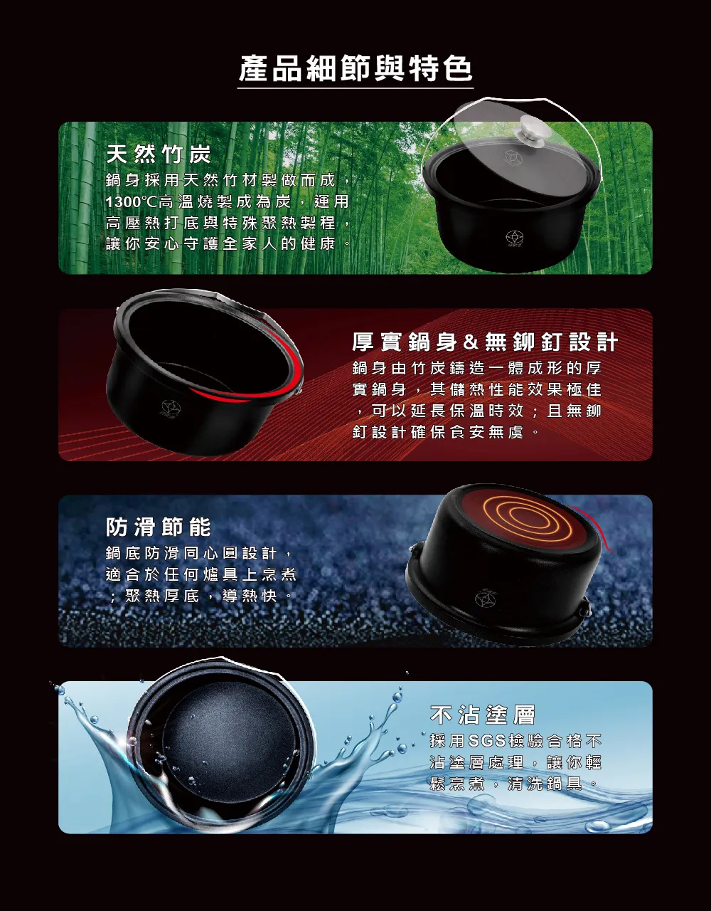 材質:炒鍋鍋身→炭、提把→304不鏽鋼、內鍋鍋蓋→強化玻璃、PP頂珠
