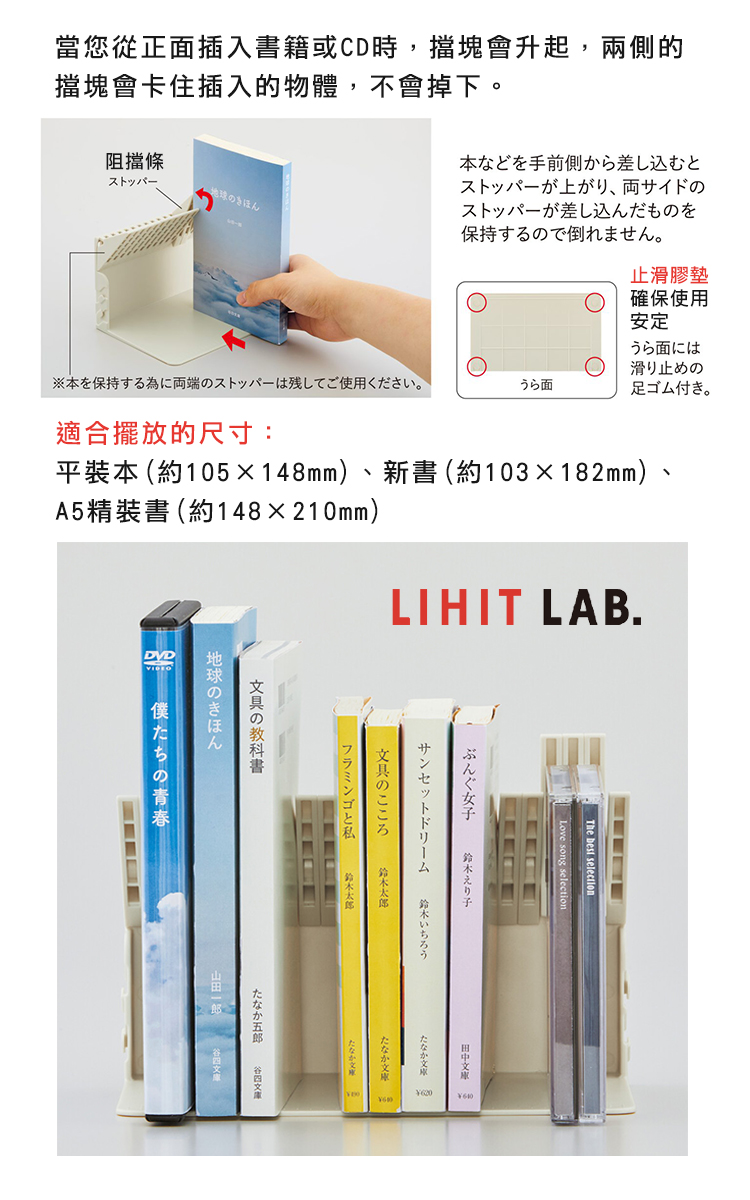 適合擺放的尺寸:平裝本(約105×148mm)、新書(約103×182mm)、A5精裝書(約148×210mm)