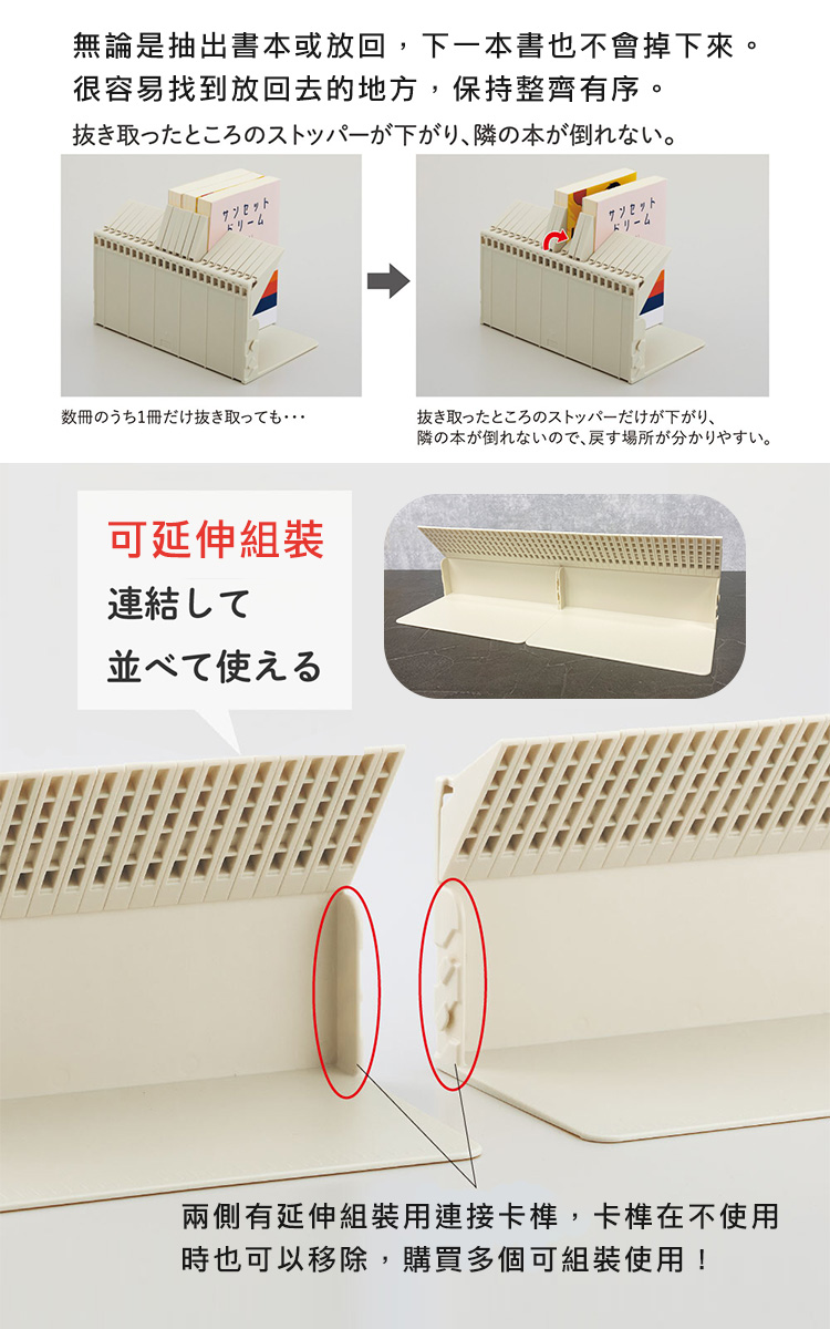 當您從正面插入書籍或CD時,擋塊會升起,兩側的擋塊會卡住插入的物體,不會掉下。兩側有延伸組裝用連接卡榫,卡榫在不使用時也可以移除,購買多個可組裝使用!