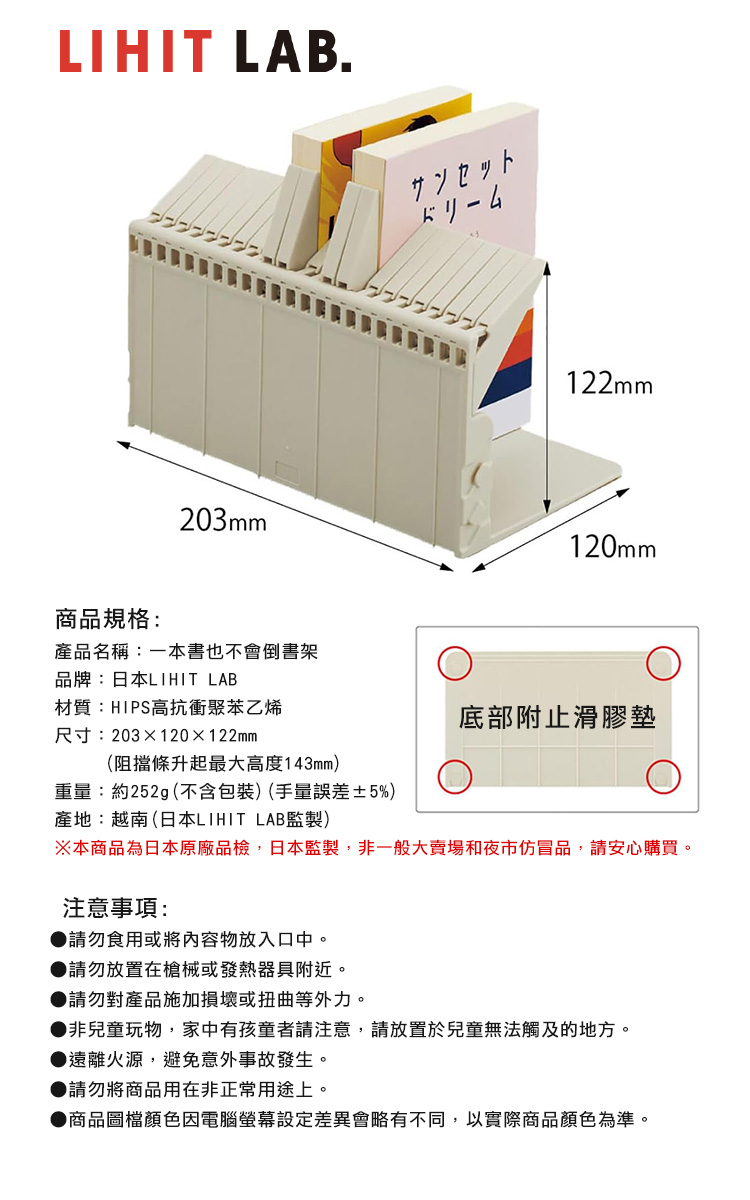 產品名稱:一本書也不會倒書架品牌:日本LIHIT LAB材質:HIPS高抗衝聚苯乙烯尺寸:203×120×122mm(阻擋條升起最大高度143mm)重量:約252g(不含包裝)(手量誤差±5%)產地:越南(日本LIHIT LAB監製)