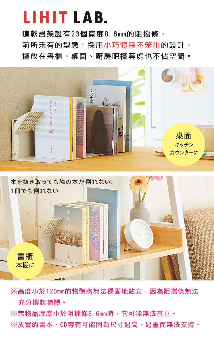 ※高度小於 120mm 的物體將無法穩固地站立,因為阻擋條無法充分撐起物體。※當物品厚度小於阻擋條 8.6mm時,它可能無法直立。※放置的書本、CD等有可能因為尺寸過高、過重而無法支撐。