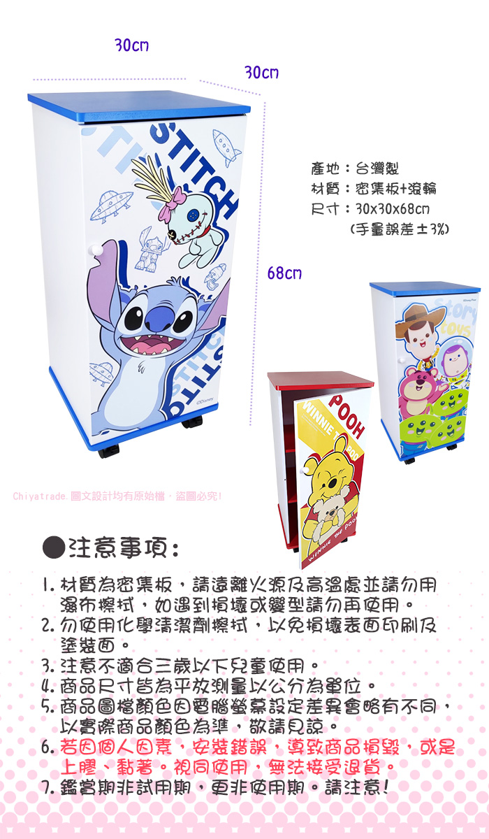 產地:台灣製材質:密集板+滾輪尺寸:30x30x68cm授權公司:華特迪士尼公司Disney