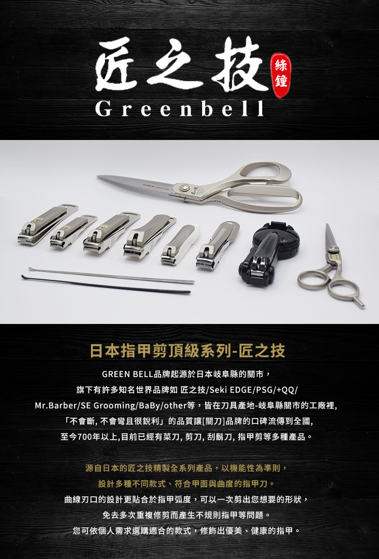 關於GREEN BELLGREEN BELL品牌起源於日本岐阜縣的關市,旗下有許多知名世界品牌如 匠之技/Seki EDGE/PSG/+QQ/Mr.Barber/SE Grooming/BaBy/other等,皆在刀具產地-岐阜縣關市的工廠裡,「不會斷、不會彎且很銳利」的品質讓[關刀]品牌的口碑流傳到全國,至今700年以上,目前已經有菜刀、剪刀、刮鬍刀、指甲剪等多種產品。