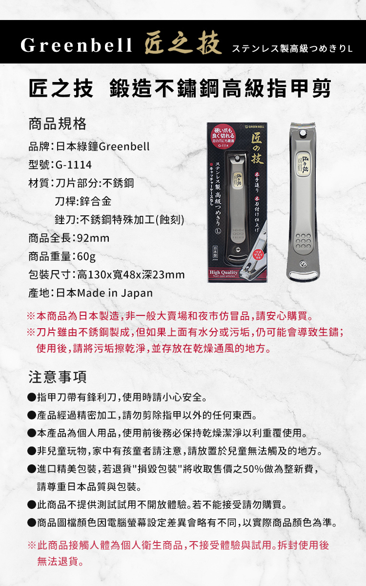 品牌:日本綠鐘Greenbell型號:G-1114材質:刀片部分-不鏽鋼 刀桿-鋅合金 銼刀-不鏽鋼特殊加工(蝕刻)商品全長:92mm商品重量:約60g (手量誤差±5%)含包裝重量:約78g (手量誤差±5%)包裝尺寸:高130x寬48x深23mm產地:日本Made in Japan