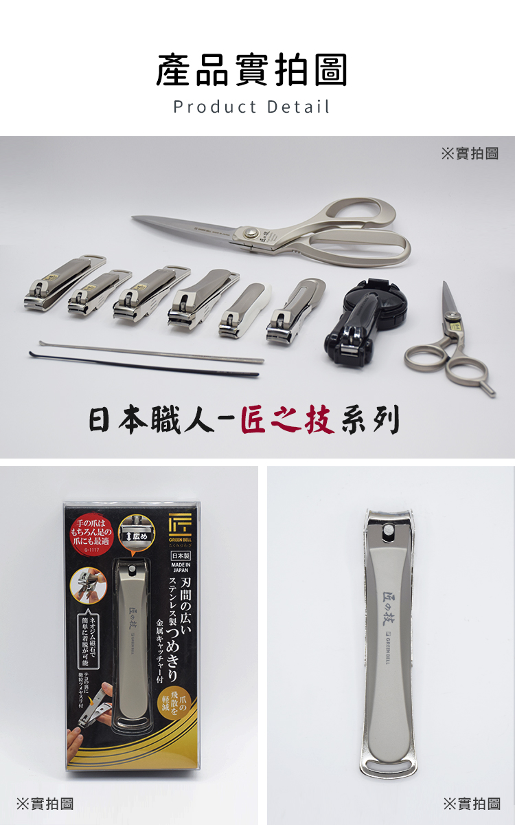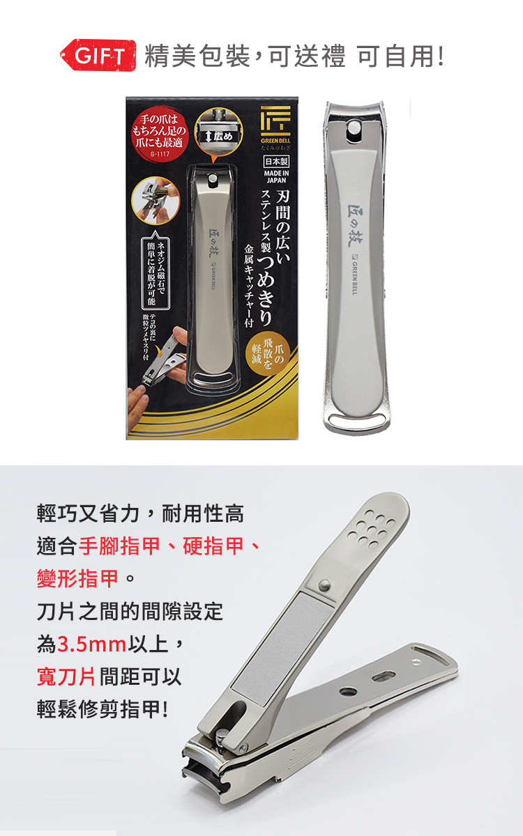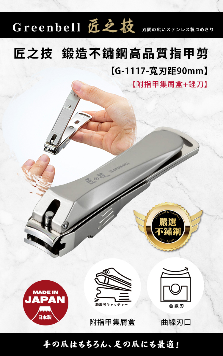 品牌:日本綠鐘Greenbell型號:G-1117材質:刀片部分-不鏽鋼 刀桿-鋅合金,鍍鎳處理 銼刀-不鏽鋼特殊加工(蝕刻) 指甲集屑盒-不鏽鋼,釹磁鐵商品全長:90mm商品重量:約75g (手量誤差±5%)含包裝重量:約101g (手量誤差±5%)包裝尺寸:高141x寬71x深22mm產地:日本Made in Japan