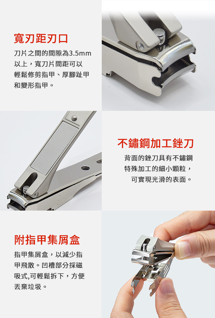 不鏽鋼高品質寬刃距指甲刀-大尺寸,適合指甲面積較大、可以剪比較厚且硬的指甲。刀片之間的間隙設定為3.5mm以上,寬刀片間距使這款指甲刀不僅可以輕鬆修剪手指甲,還可以輕鬆修剪厚腳趾甲和變形指甲。