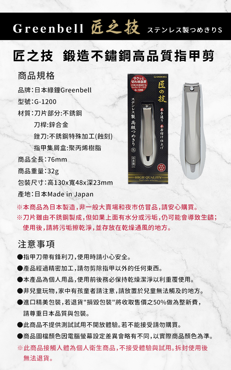 品牌:日本綠鐘Greenbell型號:G-1200材質:刀片部分-不鏽鋼 刀桿-鋅合金 銼刀-不鏽鋼特殊加工(蝕刻) 指甲集屑盒-聚丙烯樹脂商品全長:76mm商品重量:約32g (手量誤差±5%)含包裝重量:約50g (手量誤差±5%)包裝尺寸:高130x寬48x深23mm產地:日本Made in Japan