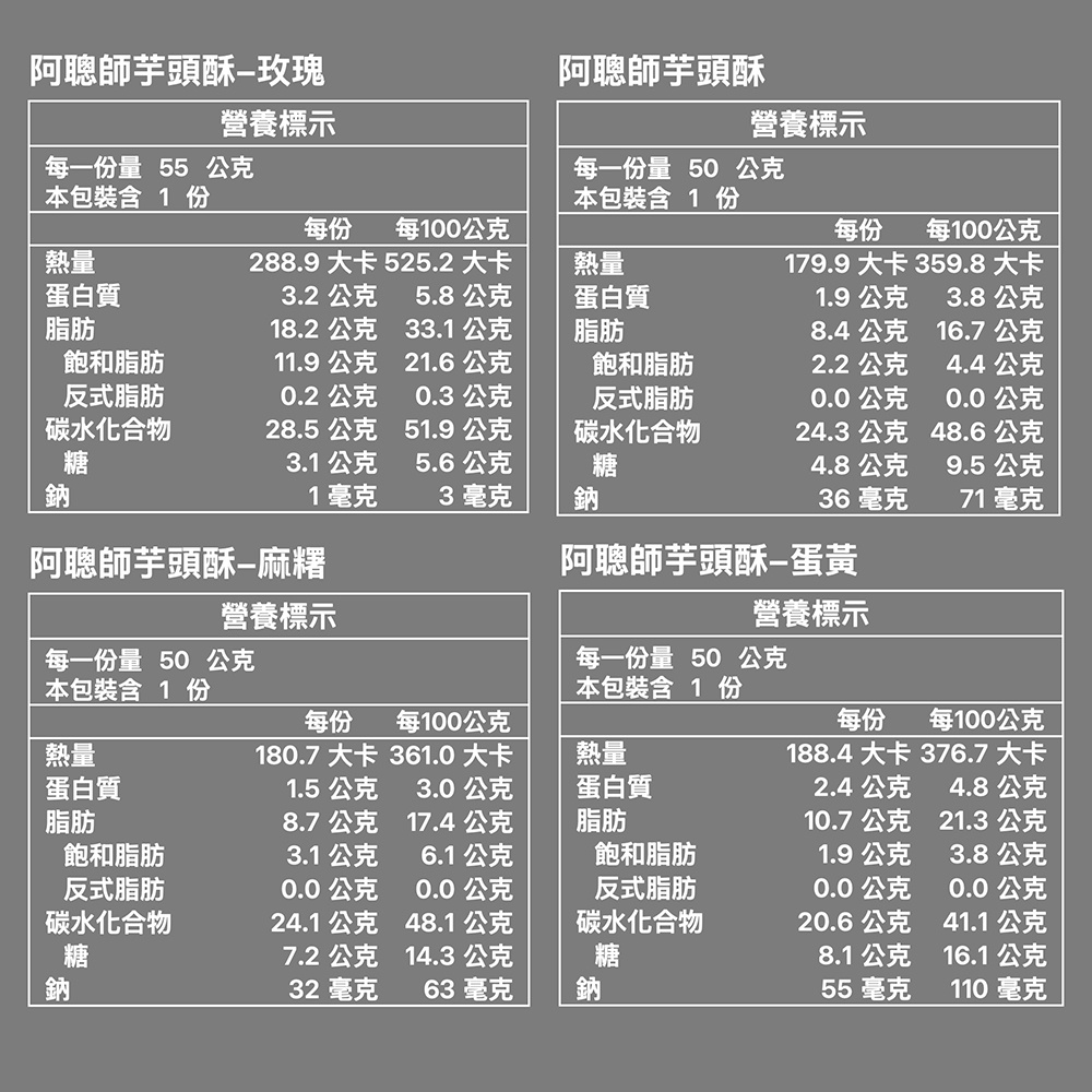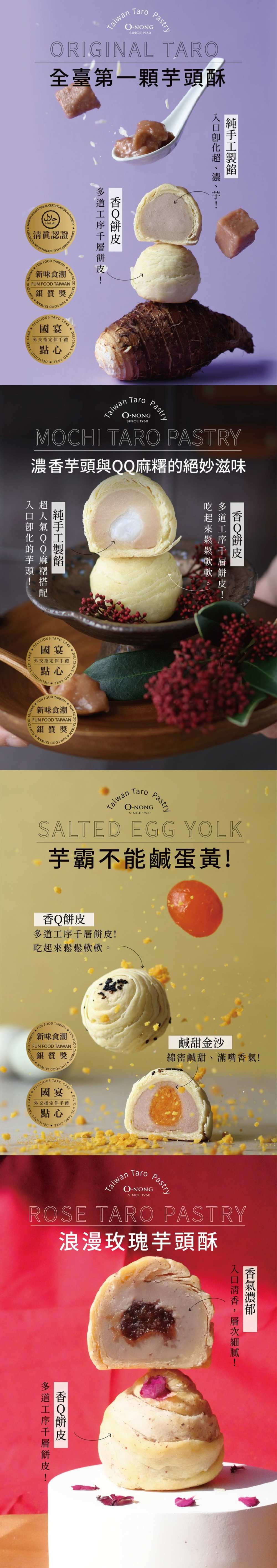 成份:芋頭酥-玫瑰商品成分:麵粉、奶油、細砂糖、芋頭玫瑰花餡{芋頭、白鳳豆、麥芽糖漿【樹薯澱粉、水】、砂糖、大豆油、麥芽糊精【樹薯澱粉、水】、D-山梨醇液70%(甜味劑)、黏稠劑、【麥芽糊精、乳糖、鹿角菜膠、刺槐豆膠、檸檬酸鈉】、脂肪酸甘油脂(乳化劑)、乙醯化己二酸二澱粉(粘稠劑)、 玫瑰花瓣、鹽、二氧化鈦(著色劑)、芋頭香精【香料、丙二醇、甘油】、著色劑【二氧化鈦、食用色素(紅色七號、藍色一號)】}、玫瑰花醬{水、D-山梨醇液70%(甜味劑)、麥芽糖漿【樹薯澱粉、水】玫瑰花瓣、乙醯化己二酸二澱粉(粘稠劑)、大豆油、脂肪酯(乳化劑)、鹽}。芋頭酥-原味商品成分:芋泥餡【芋頭、白鳳豆、蔗糖、麥芽糖、白油(棕櫚油)、大豆沙拉油、麥芽糊精、乳清、奶粉、黏稠劑(羥丙基磷酸二澱粉) 、椰漿粉(新鮮椰漿、麥芽糊精、乾酪素鈉)、鹽、香料】、麵粉、砂糖、奶油、奶粉。芋頭酥-麻糬商品成份:芋泥餡【芋頭、白鳳豆、蔗糖、麥芽糖、白油(棕櫚油)、大豆沙拉油、麥芽糊精、乳清、奶粉、黏稠劑(羥丙基磷酸二澱粉) 、椰漿粉(新鮮椰漿、麥芽糊精、乾酪素鈉)、鹽、香料】、麵粉、奶油、麻糬【甜味劑(D-山梨醇液70 %)、蔗糖、麥芽糖、羥丙基磷酸二澱粉、海藻糖、羥丙基澱粉、著色劑(二氧化鈦)、乳化劑(脂肪酸甘油酯)】、奶粉、芝麻。芋頭酥-蛋黃商品成分:芋泥餡【芋頭、白鳳豆、蔗糖、麥芽糖、白油(棕櫚油)、大豆沙拉油、麥芽糊精、乳清、奶粉、黏稠劑(羥丙基磷酸二澱粉) 、椰漿粉(新鮮椰漿、麥芽糊精、乾酪素鈉)、鹽、香料】、麵粉、砂糖、奶油、奶粉、鹹蛋黃(鴨蛋、鹽)、芝麻。保存期限:30產地:葷素標示:芋頭酥-玫瑰(奶素)芋頭酥-原味(奶素)芋頭酥-麻糬(奶素)芋頭酥-蛋黃(奶蛋素)保存方式:常溫過敏原資訊:芋頭酥-玫瑰:本產品含有麩質之穀物、牛奶及其製品,對此過敏或有特殊體質者,請避免食用。本產品生產製程廠房,其設備或生產管線有處理花生、蛋、堅果類、種子、芝麻、大豆、奇異果及其製品。芋頭酥-原味:本產品含有麩質(小麥)、奶類、堅果類(椰子)及其製品,對此過敏或有特殊體質者,請避免食用。芋頭酥-麻糬:本產品含有麩質之穀物、牛奶、椰子、芝麻及其製品,對此過敏或有特殊體質者,請避免食用。本產品生產製程廠房,其設備或生產管線有處理花生、堅果類、大豆、種子、奇異果、蛋及其製品。芋頭酥-蛋黃:本產品含有麩質之穀物、蛋、牛奶、椰子、芝麻及其製品,對此過敏或有特殊體質者,請避免食用。本產品生產製程廠房,其設備或生產管線有處理花生、堅果類、大豆、種子、奇異果及其製品。