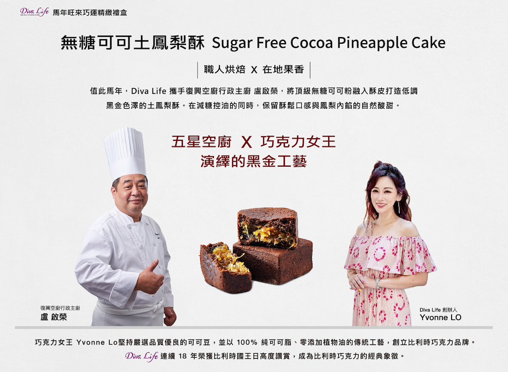 星級主廚盧啟榮,將頂級無糖可可粉絨入酥皮呈現獨特黑金色澤,既減糖控油又維持酥皮的鬆軟用35年來專業製作糕餅的經驗,重寫土鳳梨酥的歷史