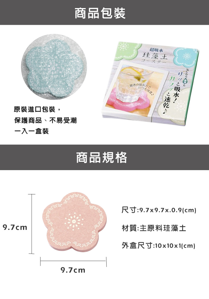 尺寸:9.7x9.7x0.9(cm)材質:珪藻土包裝尺寸:約10c10×1.2cm(一入一盒)