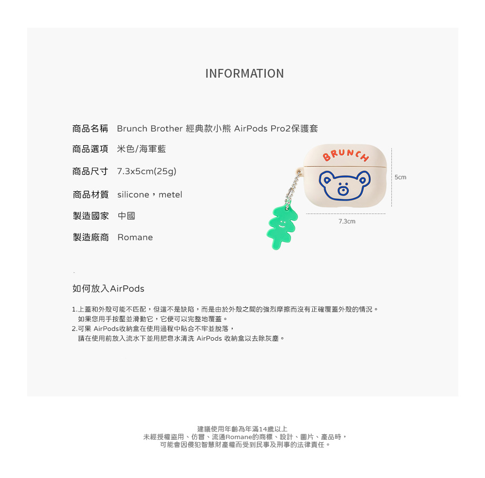 ▪️ 商品內容名稱:【Romane Brunch brother】Airpods Pro2 經典款小熊 耳機保護套貨號:米白8809209307093 / 深藍8809209307109材質:矽膠功能:收納耳機尺寸:7.5 x 3.6 x 7cm