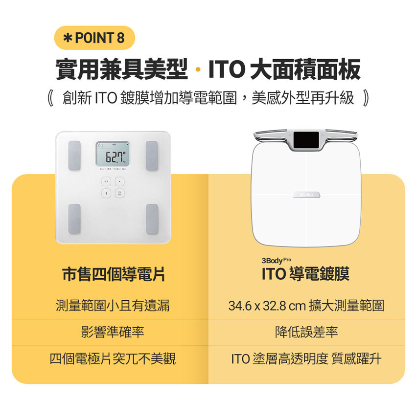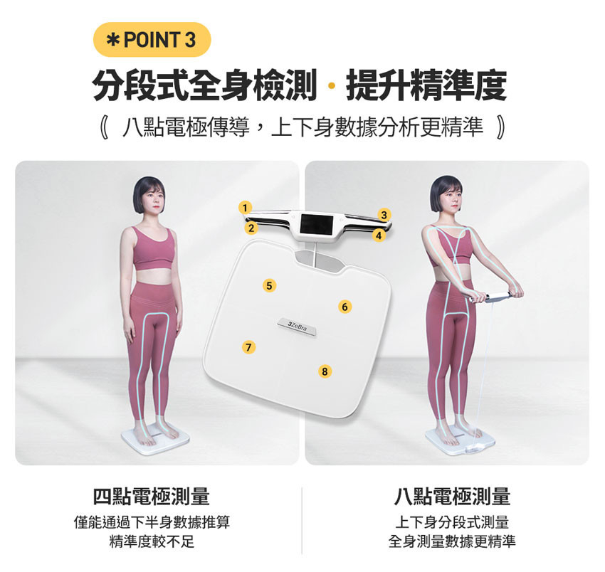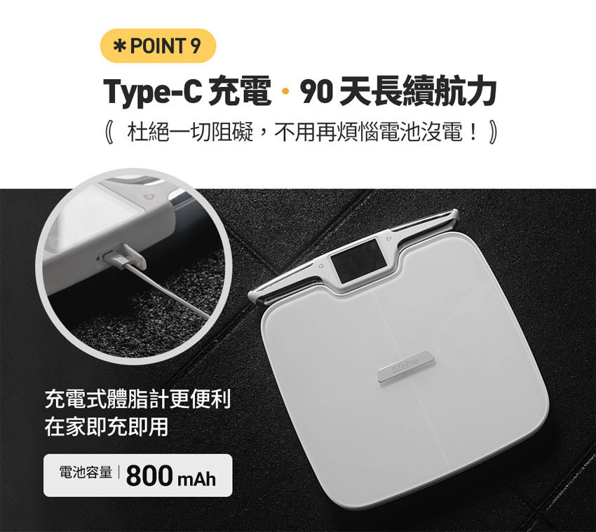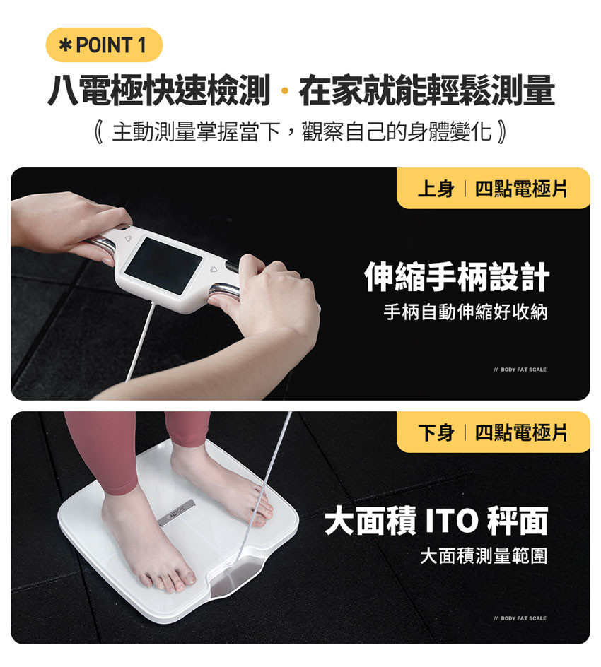 ❶ 八點電極傳導,上下身分段式測量更精準❷ 51 項綜合指標檢測,提供數據解釋及專屬建議❸ 專屬 APP 自動存取歷史紀錄,折線圖數據清楚呈現❹ 3.5 寸大液晶螢幕,免看 APP 數據即時呈現❺ ITO 大面積面板,增加導電範圍,提升外型美感❻ 6 mm 防爆鋼化玻璃,加固承重強度❼ 可新增多台手機共享體脂計,保護個人數據隱私❽ Type-C 充電式設計,即充即用免煩惱家裡沒電池❾ WIFI 連接自動同步最新版 APP,時刻保持最新版本
