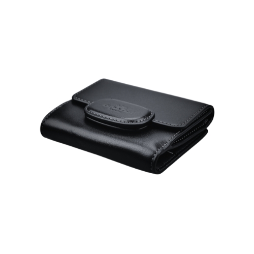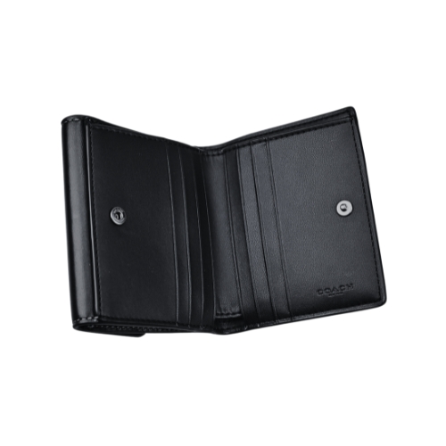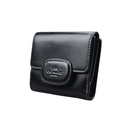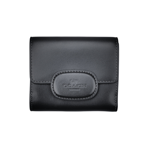 COACH ELIZA系列橢圓皮釦優雅知性、增添微微復古風格,皮革短夾採雙摺釦式開合使用便利,內置卡片格與單層鈔票夾,外部正面設置T型摺口釦式翻蓋開合零錢袋,造型、實用兼具,尺寸便攜好收納。