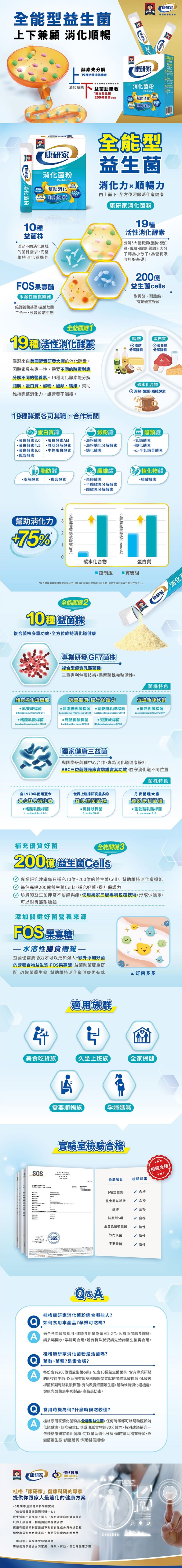 成分/內容物:赤藻糖醇(甜味劑)、難消化性麥芽糊精、果寡醣、乳酸菌[GF7菌(Lactobacillus casei、Lactobacillus plantarum、Lactobacillus rhamnosus、Bifidobacterium lactis GF211、Bifidobacterium breve、Lactobacillus paracasei GF611、Lactobacillus acidophilus GF308)、健康三益菌(Bifidobacterium lactis、Lactobacillus acidophilus、Lactobacillus paracasei)]、柳橙果汁粉(柳橙濃縮汁、麥芽糊精)、葡萄糖、綜合消化酵素[麥芽糊精、澱粉酵素、植酸酵素、糖化酵素、複合酵素(含脂解酵素、蛋白酵素、澱粉酵素、麥芽糊精)、中性蛋白酵素、鳳梨酵素、蛋白酵素4.5、轉化酵素、蛋白酵素3.0、半纖維素分解酵素、果膠酵素、α-半乳糖苷酵素、蛋白酵素AM、脂解酵素、胜肽分解酵素、乳糖酵素、蛋白酵素6.0、澱粉糖化分解酵素、纖維素分解酵素]、麥芽糊精、香料、非氫化棕櫚仁油、檸檬酸、乳清粉、β-胡蘿蔔素、羧甲基纖維素鈉。