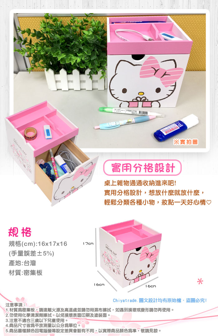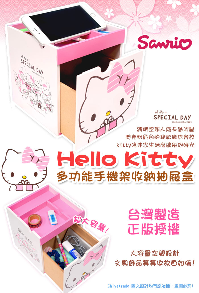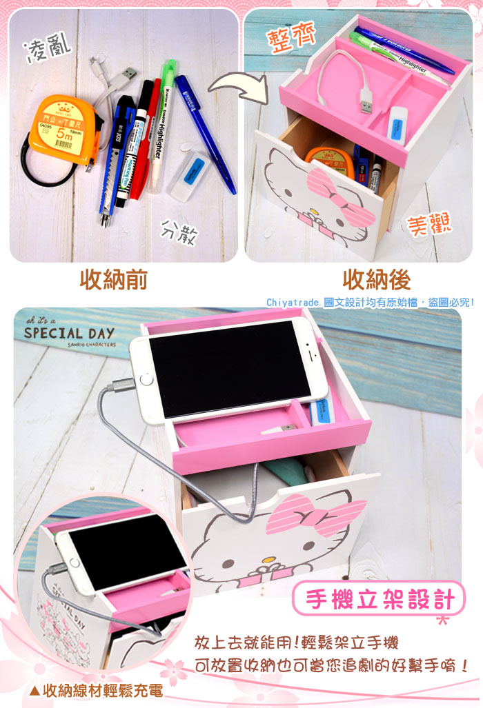 ●超可愛KITTY印花造型特色十足!●手機架設計 收納同時充電超便利●開放式分格收納,隨心取物好方便●大容量空間設計,文具飾品等等收放自如唷!●100%台灣製造正版授權