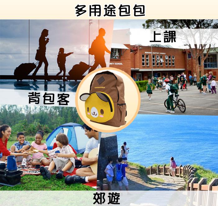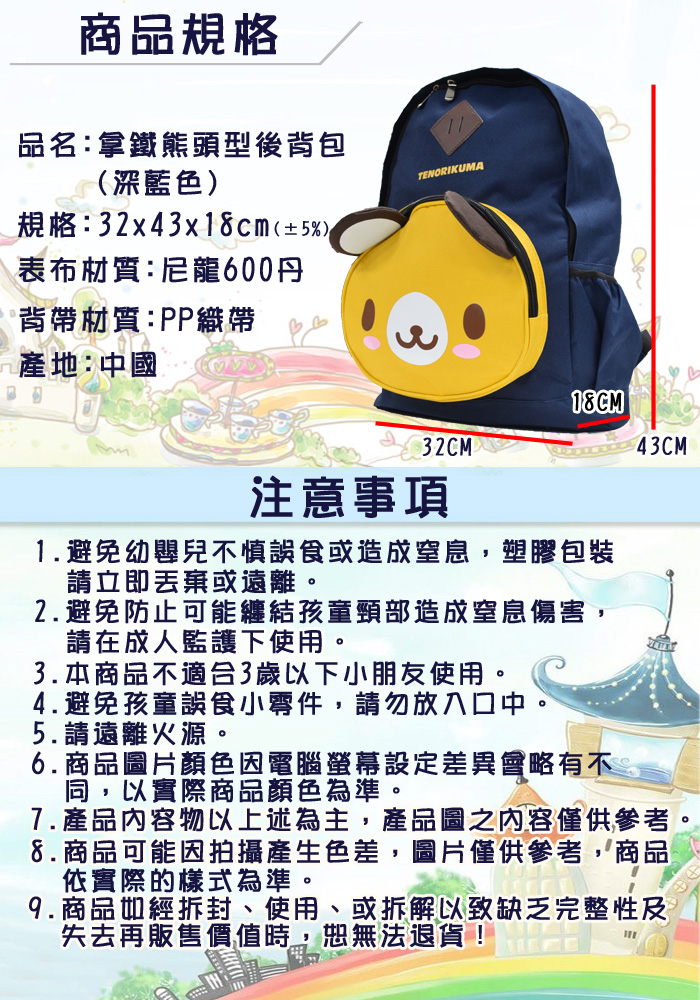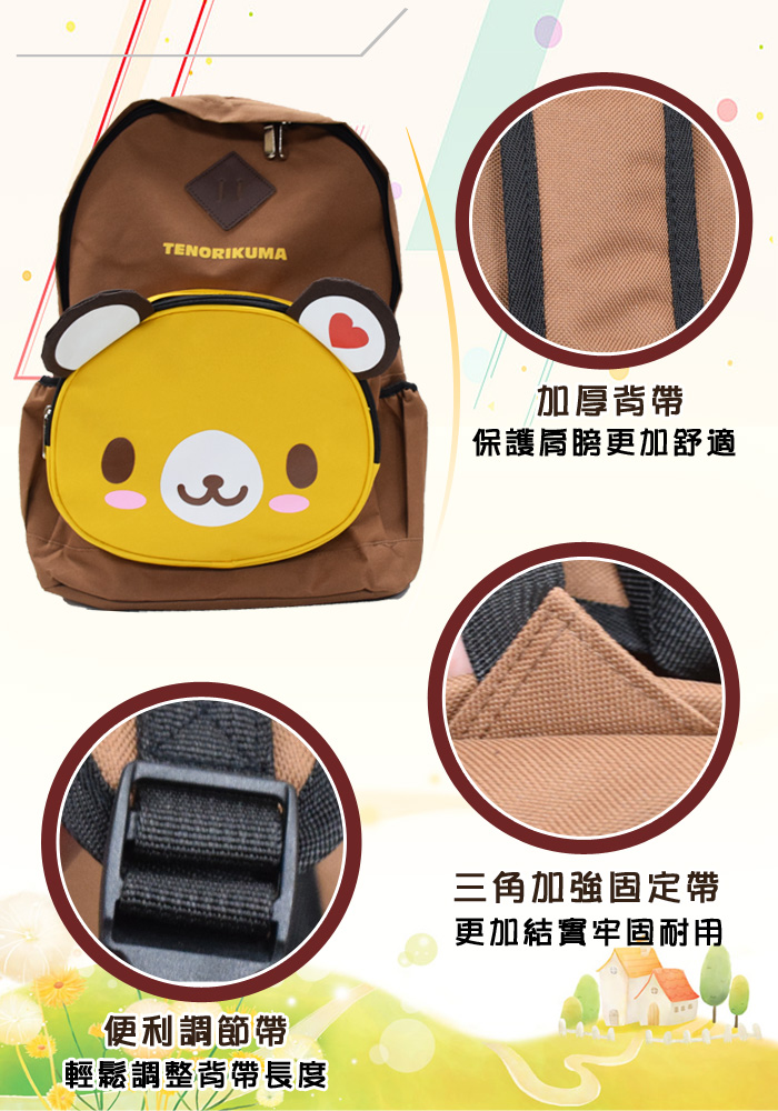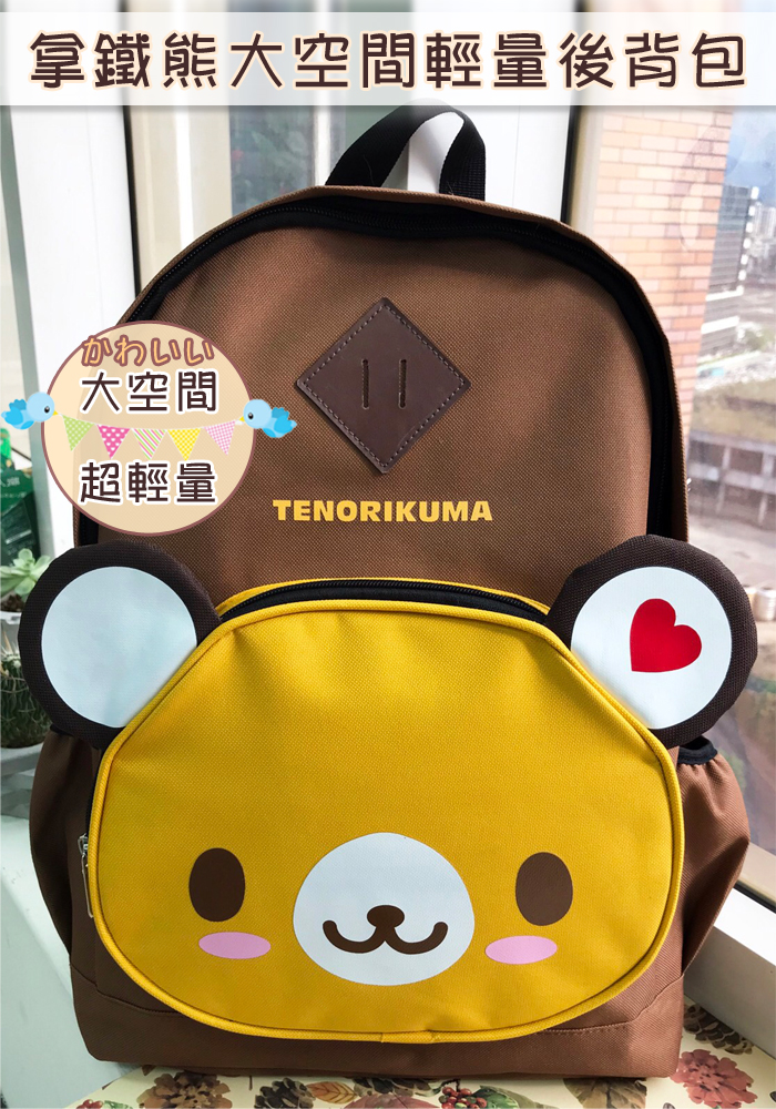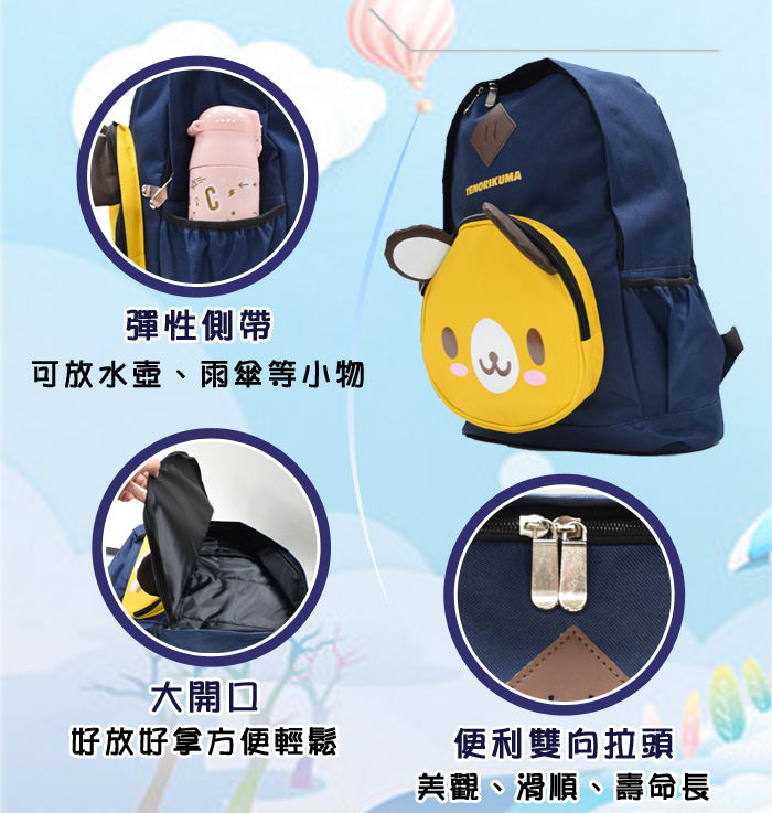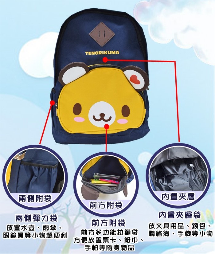 加寬背帶-減輕背負壓力,讓肩膀更舒適。兩側附彈力袋-可放置水壺、雨傘、眼鏡盒等小物。前方附袋-是立體大頭拿鐵熊,可愛又實用。方便放置票卡、紙巾、手帕等隨身物品。內置夾層袋-可放置文具用品、錢包、聯絡簿、手機等小物。