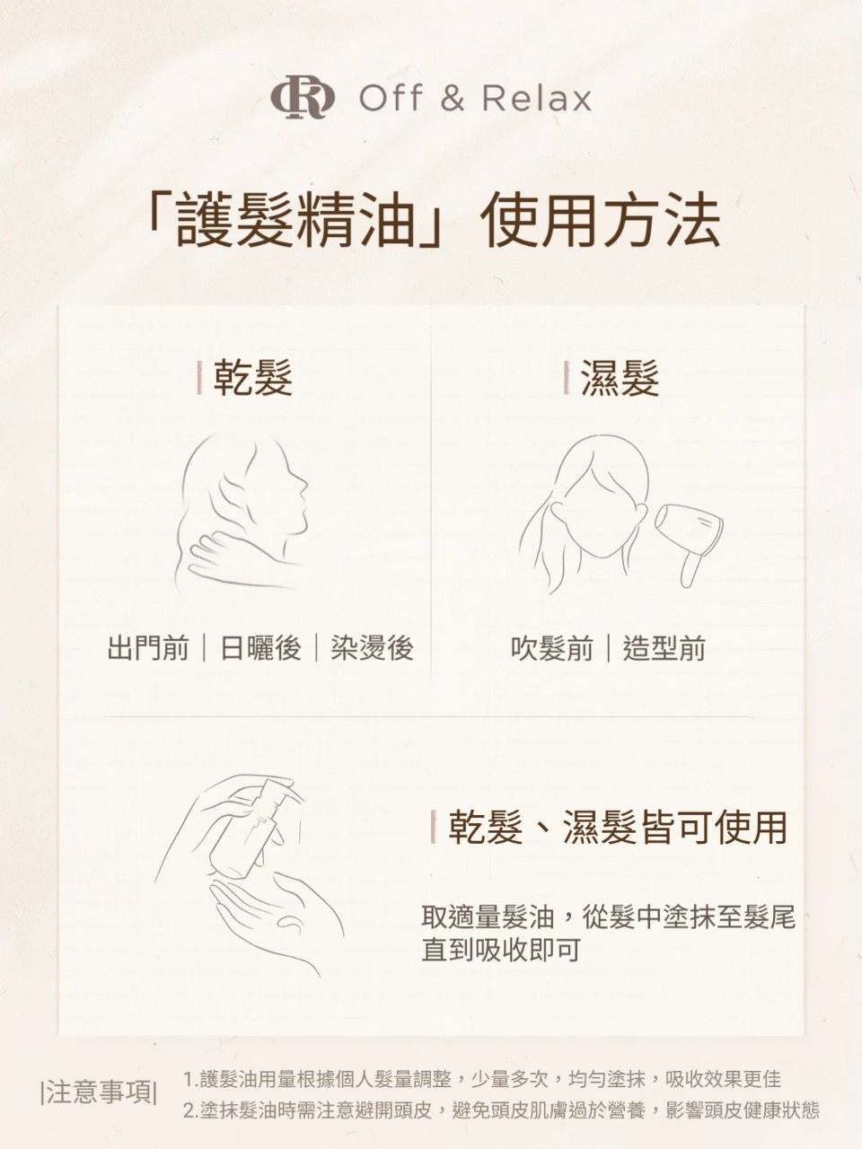 乾髮/濕髮 吹髮時、用造型時,髮尾均勻塗抹護髮精油,直到吸收即可