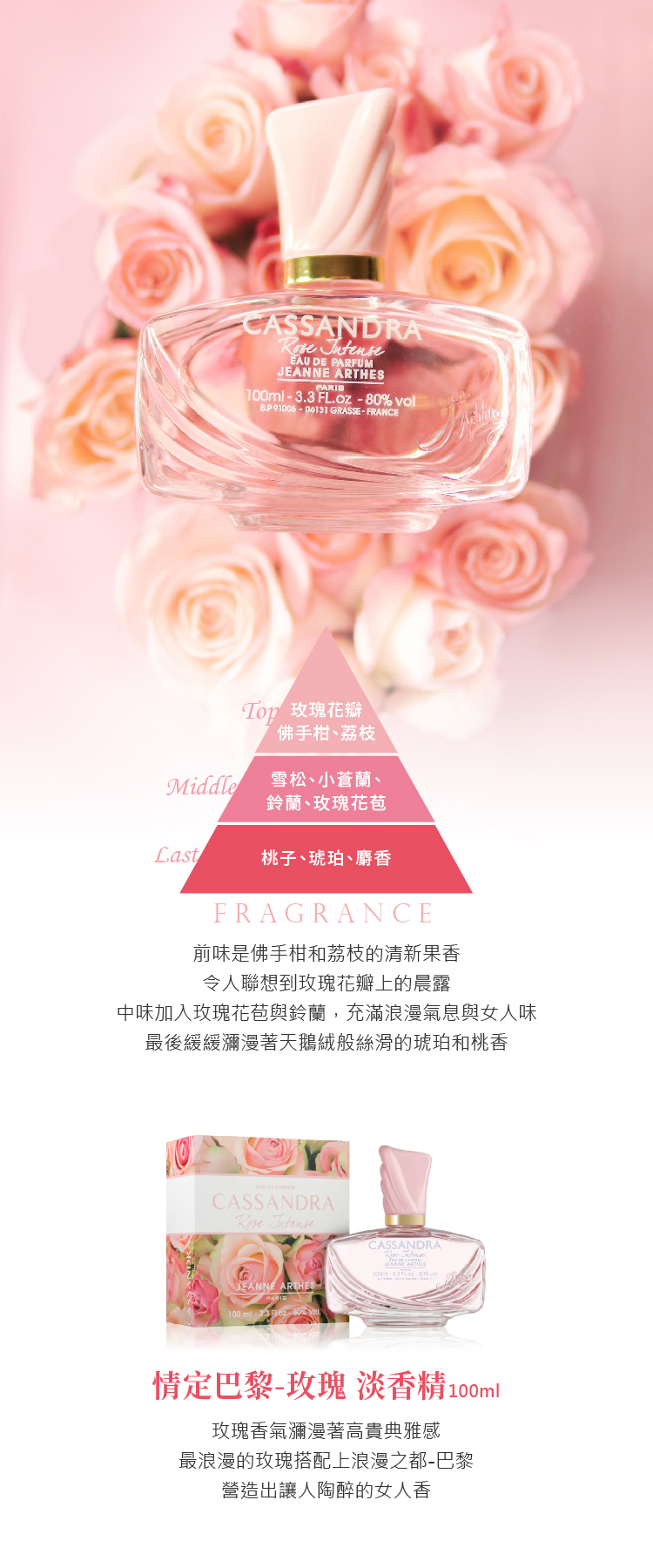 前味:玫瑰花瓣、佛手柑、荔枝中味:雪松、小蒼蘭、鈴蘭、玫瑰花苞後味:桃子、琥珀、麝香